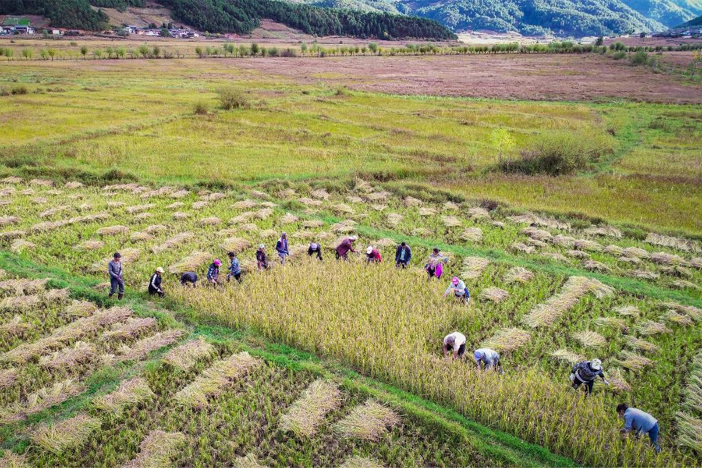 云南省维西傈僳族自治县攀天阁乡皆菊村群众在收割黑稻(无人机照片)。新华社发(李建生 摄)