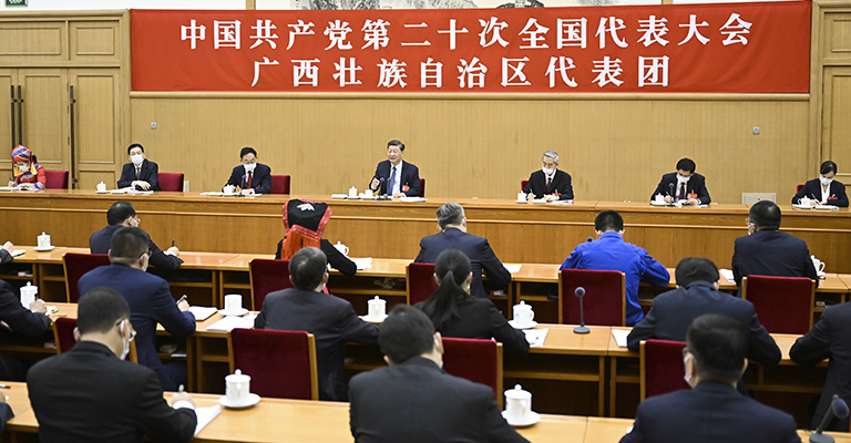 习近平同志17日上午在参加党的二十大广西代表团讨论时强调,党的二十大报告进一步指明了党和国家事业的前进方向,是我们党团结带领全国各族人民在新时代新征程坚持和发展中国特色社会主义的政治宣言和行动纲领。学习贯彻党的二十大精神,要牢牢把握过去5年工作和新时代10年伟大变革的重大意义,牢牢把握新时代中国特色社会主义思想的世界观和方法论,牢牢把握以中国式现代化推进中华民族伟大复兴的使命任务,牢牢把握以伟大自我革命引领伟大社会革命的重要要求,牢牢把握团结奋斗的时代要求。全党全国各族人民要在党的旗帜下团结成“一块坚硬的钢铁”,心往一处想、劲往一处使,推动中华民族伟大复兴号巨轮乘风破浪、扬帆远航。