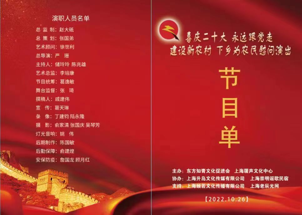 老辰光网讯(宋爱国报道) 十月的崇明,秋高气爽。东方知青组织的“喜庆二十大 下乡为农民”的演出活动,将于10月27日上午在崇明港西镇协西村举行。演出活动由上海颐若文化传播有限公司董事长赵大砥为总监制、东方知青文化促进会会长张国弟为总策划,严珊为总导演。