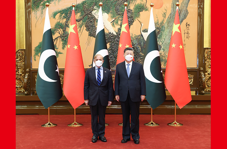 习近平介绍了中国共产党第二十次全国代表大会取得的重要成果。习近平指出,中国将继续坚持对外开放基本国策,不断以中国新发展为包括巴基斯坦在内的世界各国提供新机遇。中方愿同巴方深化发展战略对接。双方要用好中巴经济走廊联合合作委员会机制,以更高效率推进中巴经济走廊建设,将其打造成“一带一路”高质量发展示范性工程。要加快推进瓜达尔港配套基础设施建设,发挥港口对地区联通发展的辐射带动作用。双方要共同努力,为早日实施一号铁路干线升级改造项目和卡拉奇环城铁路项目创造条件。中方欢迎巴基斯坦扩大优质农产品对华出口,愿同巴方拓展数字经济、电子商务、光伏等新能源合作,扎实推进农业、科技、民生等领域合作,将继续为巴方稳定金融形势提供力所能及的支持。中方支持中国工业强省同巴方结对子推进产业合作,希望巴方提供良好营商环境。我高度牵挂在巴中国人的安全问题,希望巴方为赴巴基斯坦开展合作的中国机构和人员提供可靠安全环境。