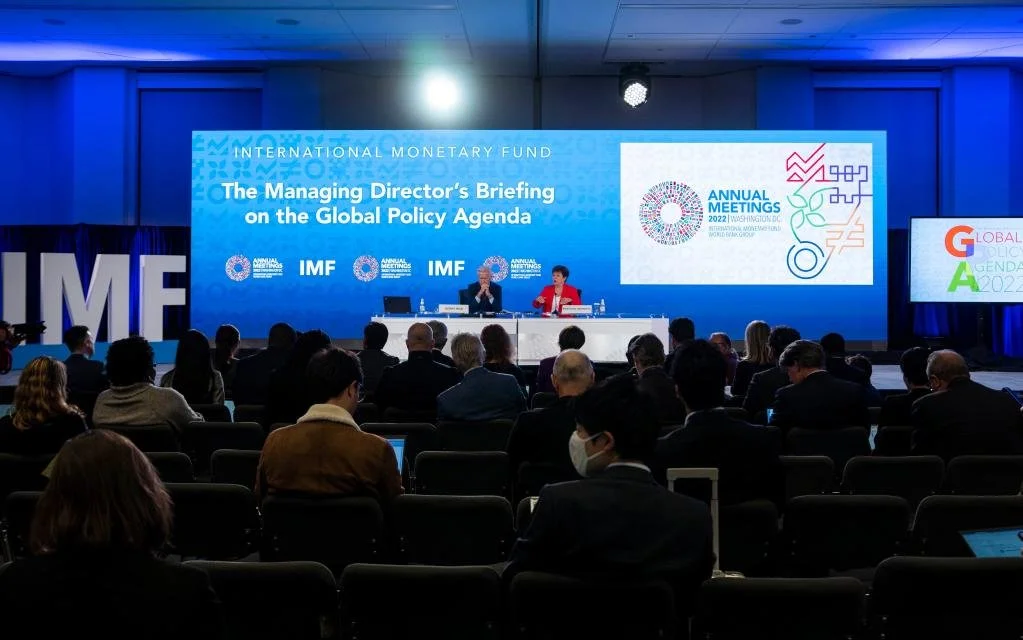 10月13日,在美国华盛顿,国际货币基金组织(IMF)总裁格奥尔基耶娃(右)出席记者会。(新华社记者刘杰摄)