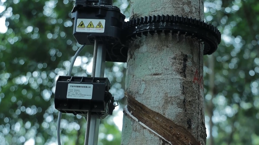 今年,在中国船舶集团的定点帮扶项目支持下,智慧胶园落地云南省西双版纳州勐腊县。全智能割胶机器人安装后,胶农只需在手机上下载App,便能在家操控机器人割胶,告别了披星戴月的“点灯割胶”方式。