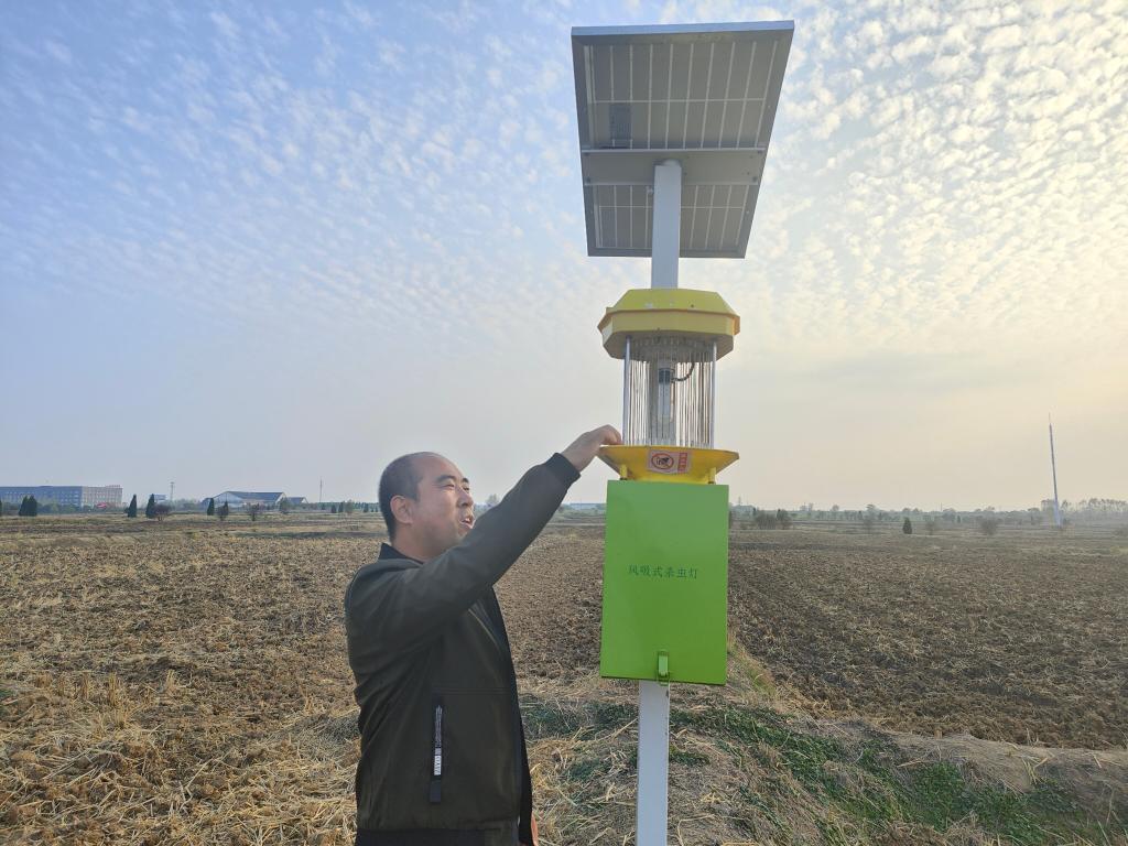 闫大明正在介绍风吸式杀虫灯。新华社记者 姜刚 摄