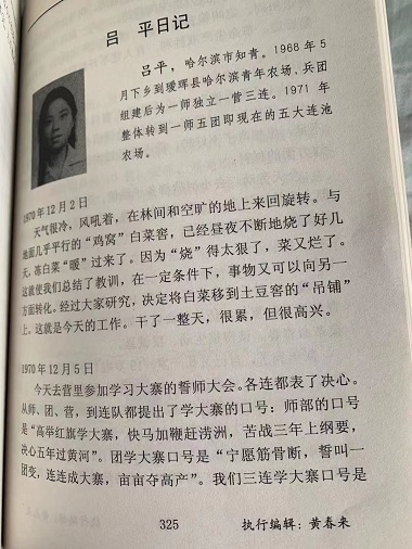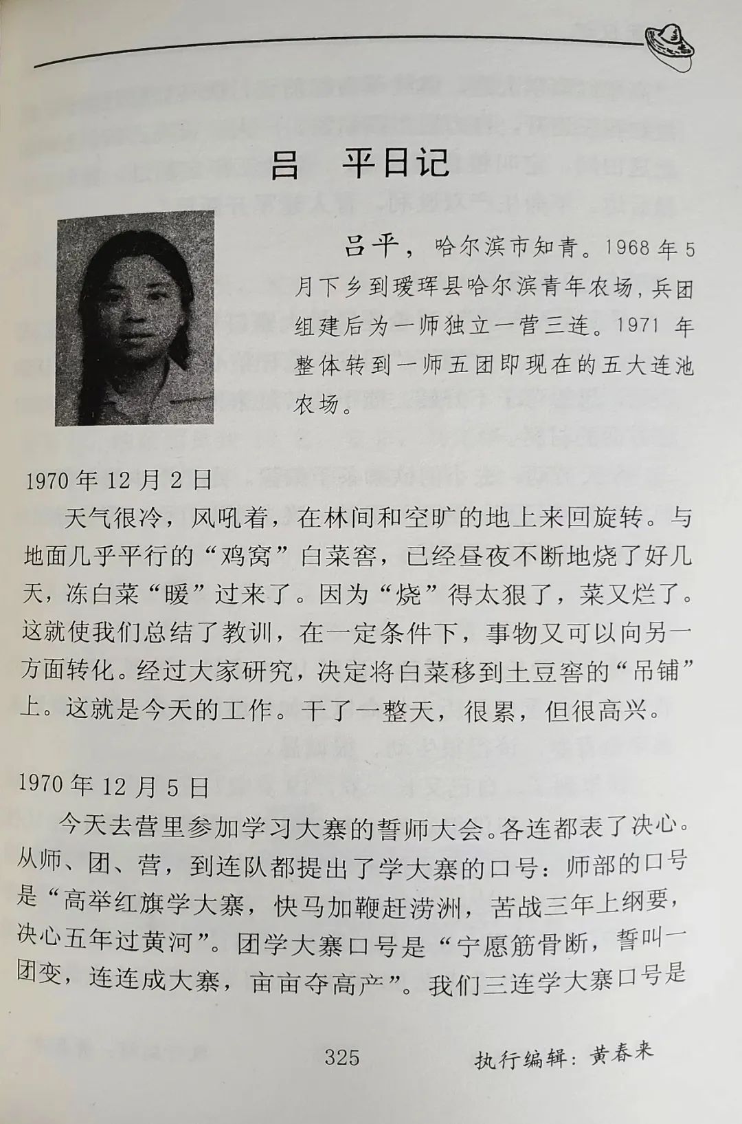 吕平:哈尔滨知青,1968年5月(15岁)下乡到黑龙江省爱辉县哈尔滨青年农场,兵团组建后为一师独立一营三连,1971年整体转到一师五团,即现在的五大连池农场。,