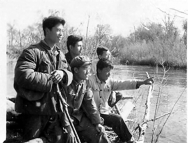前左:赵福兴,于国霖,张坦,后左:王冬,吕为,这是下乡在南北河畔,他们都曾经在豆腐房工作,(黄定天拍摄)