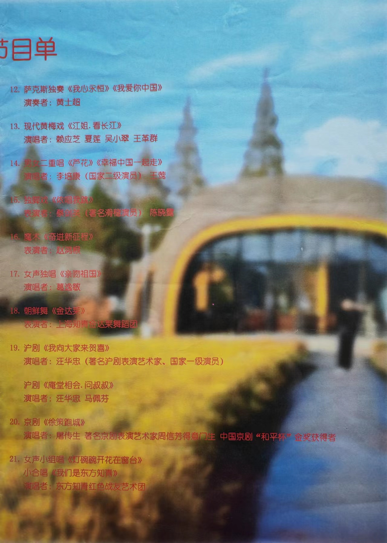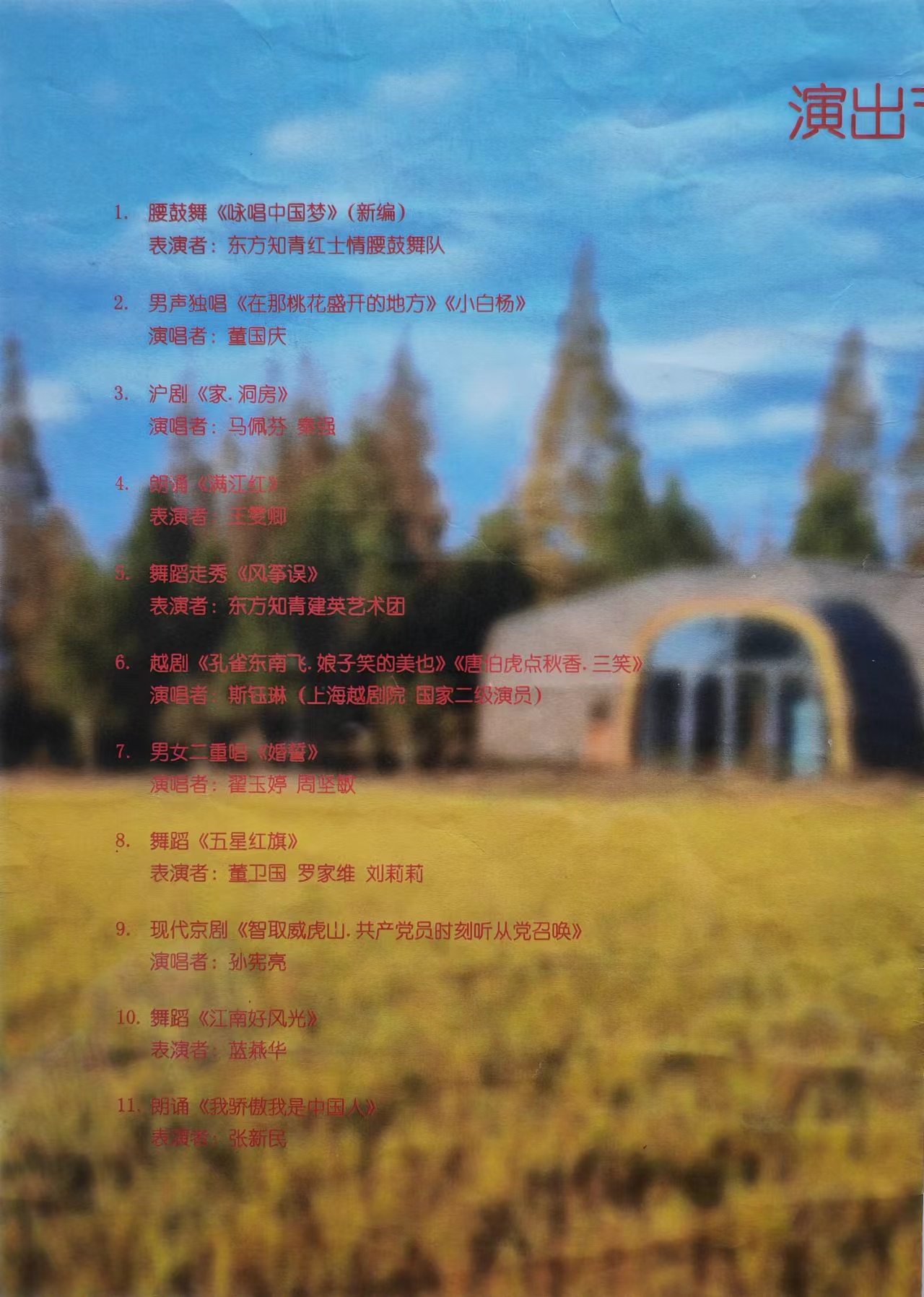 东方知青红土地腰鼓舞队开场表演的《咏唱中国梦》,阵阵鼓声催人激奋,腰鼓队的表演烘托了演出场的气氛。演出节目品种多样,有歌舞朗诵、有管乐奏曲,有传统和现代戏剧,还有魔术滑稽小品等共21个节目,节目反映了歌唱祖国,建设新农村的愿景和人民对美好生活的想往。演员张新民朗诵的《我骄傲我是中国人》,诵出了中华民族的自豪感。现代黄梅戏《江姐.看长江》重温了为建立新中国革命烈士的壮烈,当主持人介绍四名女演员是安徽来沪的打工者时,观众们对她们爆以掌声,欢迎和感谢她们为上海建设作出的贡献。小演员王雯卿朗诵的岳飞《满江红》铿锵有力。演员葛逸敏倾情演唱《亲吻祖国》,还走下舞台与村民热情握手致亲切的问候。《奋进新征程》的表演魔术师赵鸿根,在众目睽睽下走到观众席钓出了一条大活鱼,使观众惊诧不已。著名滑稽演员蔡剑英也来到演出现场,表演的《侬唱我跳》惟妙惟肖,换来观众们的阵阵笑声。著名沪剧表演艺术家、国家一级演员汪华忠与合作表演的马佩芬,演出的沪剧《庵堂相会.问叔叔》,以及国家二级演员斯钰琳演出的越剧《孔雀东南飞.娘子笑的美也》等节目,让观众享受了国家级水准的演唱。著名京剧表演艺术家周信芳得意门生、中国京剧“和平杯”金奖获得者屠传生已83岁高龄,他的京剧《徐策跑城》演唱的有板有眼,赢得观众的热烈掌声。