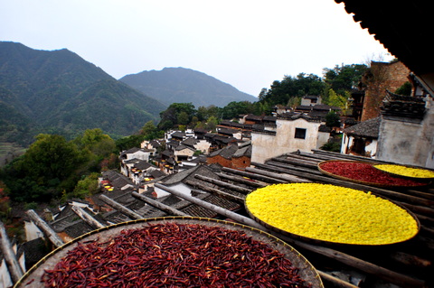 篁岭古村“地无三尺平”,农作物无处晾晒,智慧的先民们便利用自家窗台、屋顶作晒台:春晒茶叶、水笋,夏晒茄子、南瓜,秋晒玉米、稻谷、红辣椒,冬晒香菇和熏腊鸡鸭……四季流转,篁岭像一个巨大的“调色盘”,跟随季节变迁着色。
