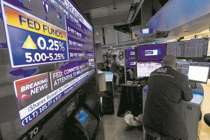 5月3日,交易员在美国纽约证券交易所内工作,附近的显示屏上显示着美联储再次上调联邦基金利率目标区间25个基点的新闻。 新华社发