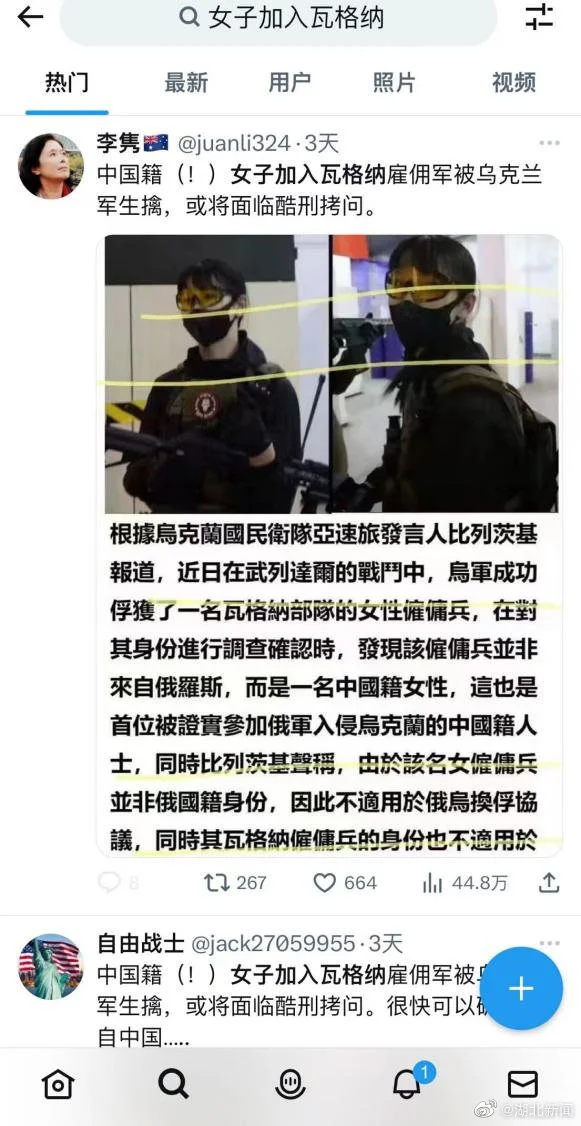 近日外网疯传,一中国籍女子加入俄罗斯私人军事公司“瓦格纳”,在俄乌战争中被乌军生擒,这则消息引发众多网友关注。