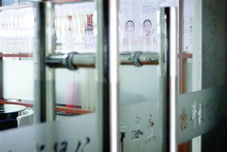 图片说明:在“徒手整形”的公司墙上贴着徒手整形的宣传广告,吹嘘上完三天课,每个月可以赚十几万