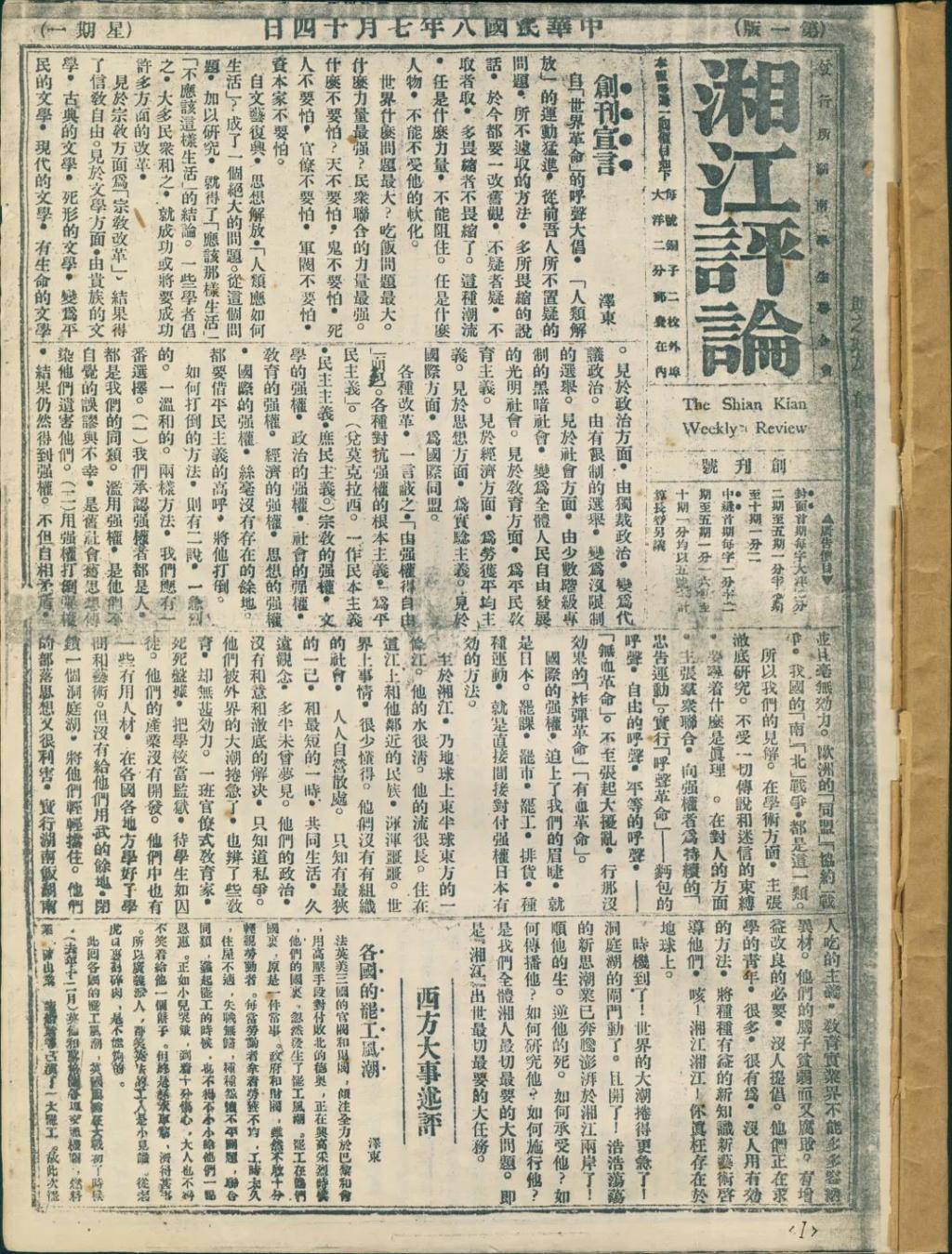 至于为什么主编《湘江评论》,毛泽东没有给出过正面回答。《湘江评论》的创刊号启事这样写道:“本报以宣传最新思潮为主旨。篇幅每周一张,有重要文字,发行增刊。文字全用国语。”