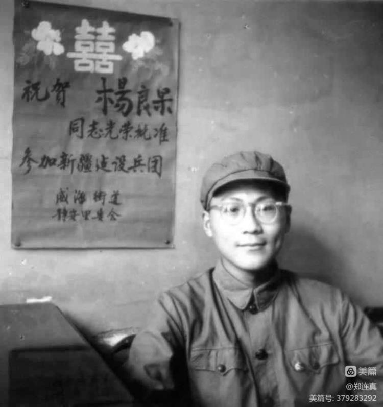 在进疆行军途中,杨良果是我们中队长。他个头中等偏高,身穿一套崭新 的军装,头上的军帽绷得好像有点紧。帽檐下架着一副眼镜,近视镜片后一双 黑眼睛,炯炯有神,充满了睿智和敏锐。脸颊上时隐时现的酒窝,见人总面带 微笑,让人感到亲切。他出身于书香门第,从小受过良好的教育。真情待人, 执着做事,是他为人处事的准则。按年龄他比我小两岁,但我始终把他视为自 己的学长。