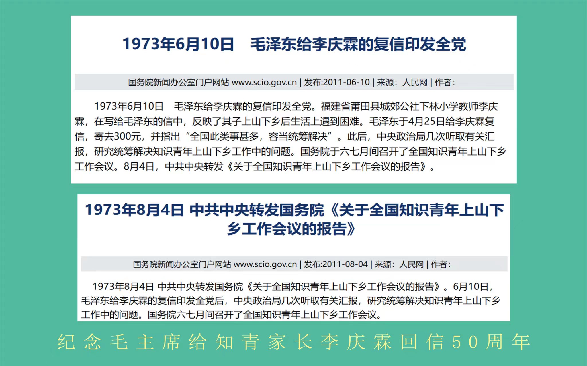 与会知青先后回顾了五十年前李庆霖给毛主席写信、毛主席复信的历史事件。李庆霖给毛主席写信的原因是反映其儿子在上山下乡中生产、生活上遇到困难,到县里找负责知青主管单位反映,一直没有结果的情况下,向毛主席“告了御状”。李庆霖“告御状”事件使知识青年上山下乡工作中长期存在的具体问题得到缓解,在一定程度上起到了保护知青的人身权利,改善了他们的生活条件。加强了中央及各地知青办的组织机构适应知青工作发展的需要。与会知青分析了“告御状”的作用和意义,认为毛泽东主席亲自给一个普通知青家长回信,不仅是对李庆霖一家的关心帮助,更体现了对1700万知青的关怀、对知青锻炼成长的重视。这也体现了领袖一贯的实事求是、体察民情的作风。