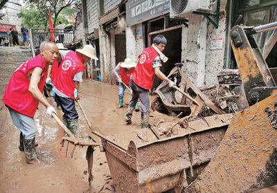 6日,五桥街道香炉山社区干部和志愿者在清理淤泥。本报记者 姜 峰摄