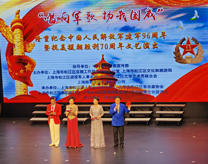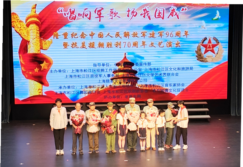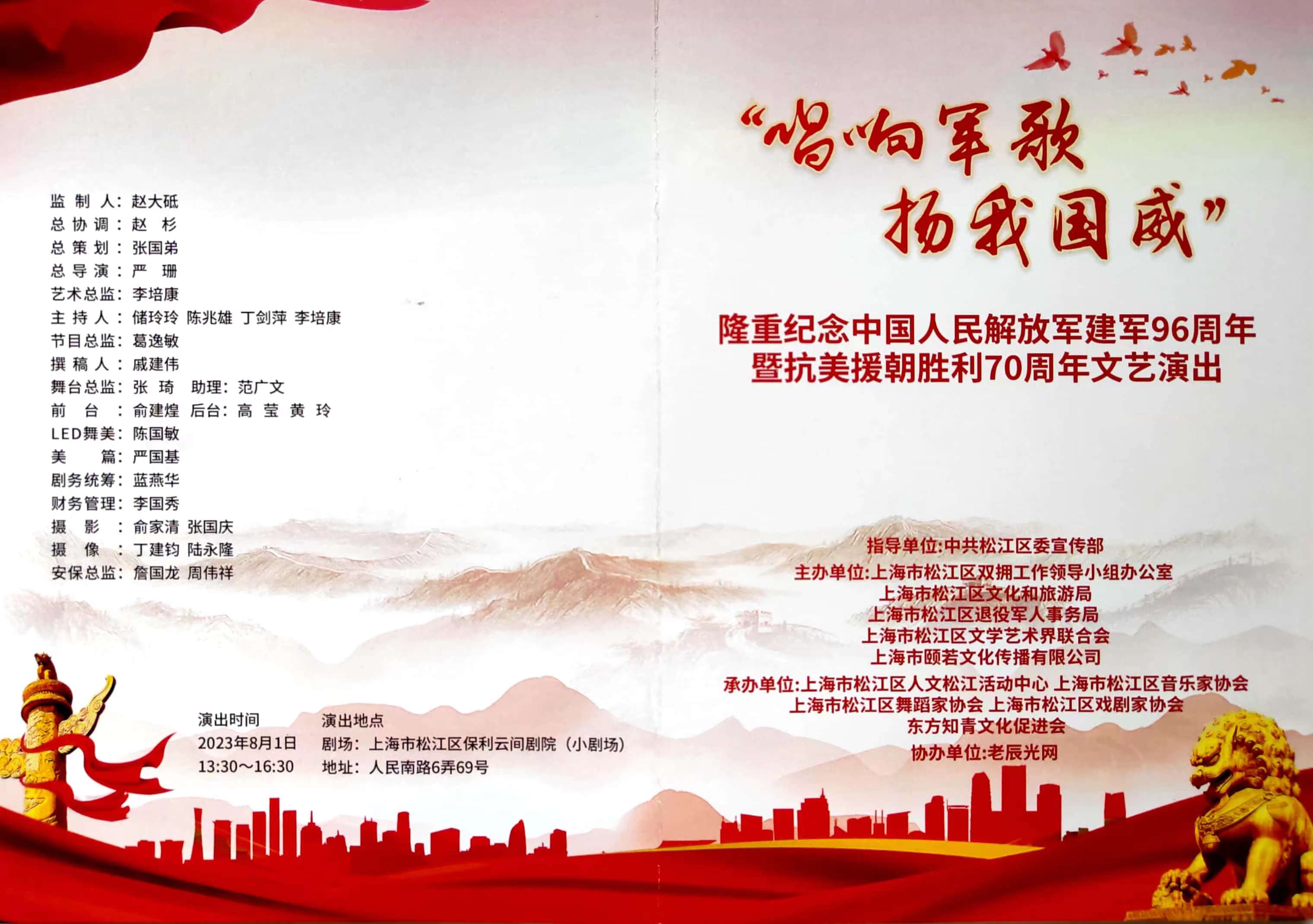 2023年8 月1 日下午,一场由中共松江区委宣传部指导,松江区双拥工作领导小组办公室、松江区文化和旅游局、松江区退役军人事务局、松江区文学艺术界联合会、上海颐若文化传播有限公司主办,松江区人文松江活动中心、松江区音乐家协会、松江区舞蹈家协会、松江区戏剧家协会、东方知青文化促进会承办,老辰光网协办的“纪念中国人民解放军建军96 周年,抗美援朝胜利70周年”《唱响军歌,扬我国威》文艺演出在松江保利云间剧场隆重举行。