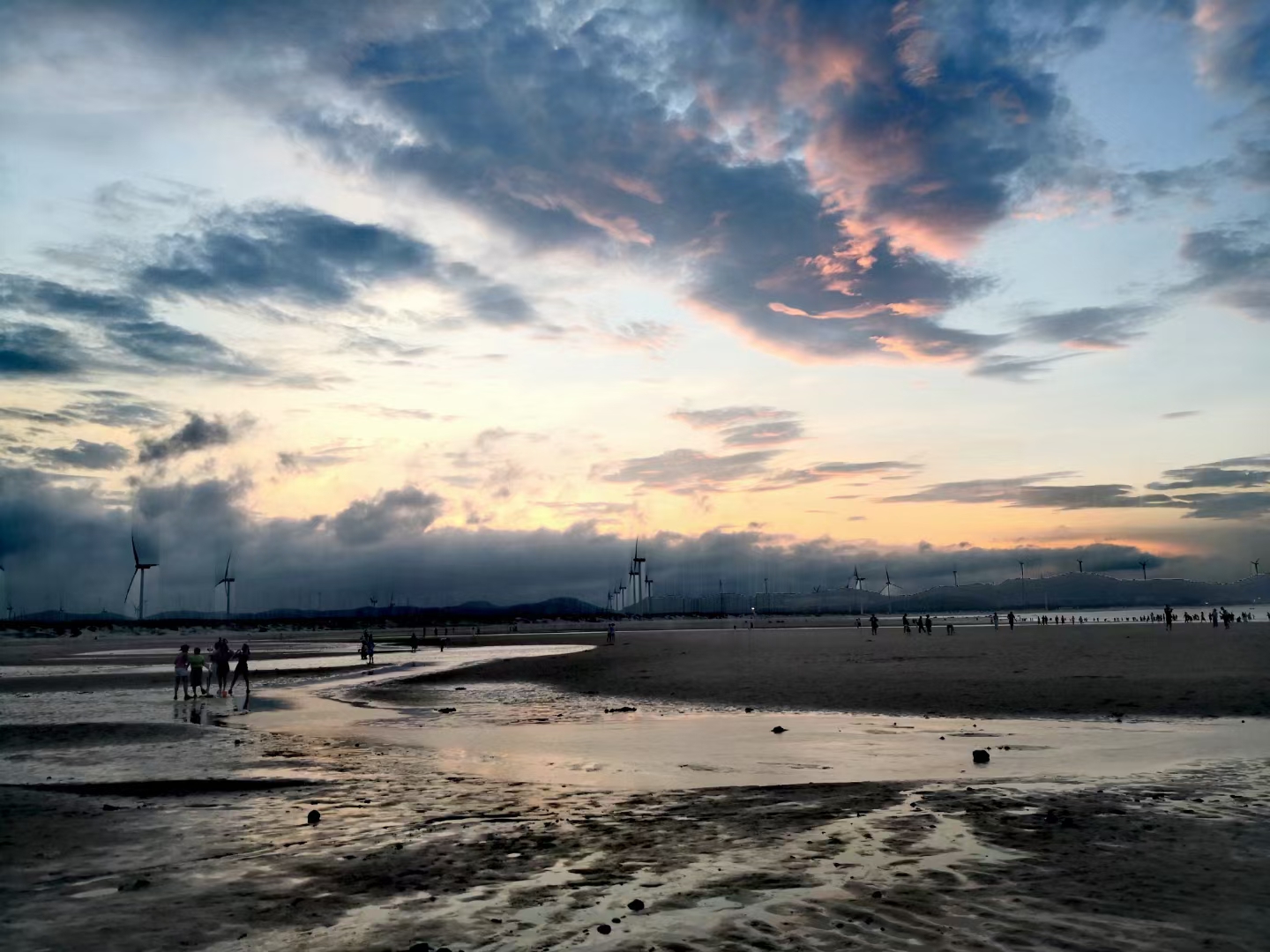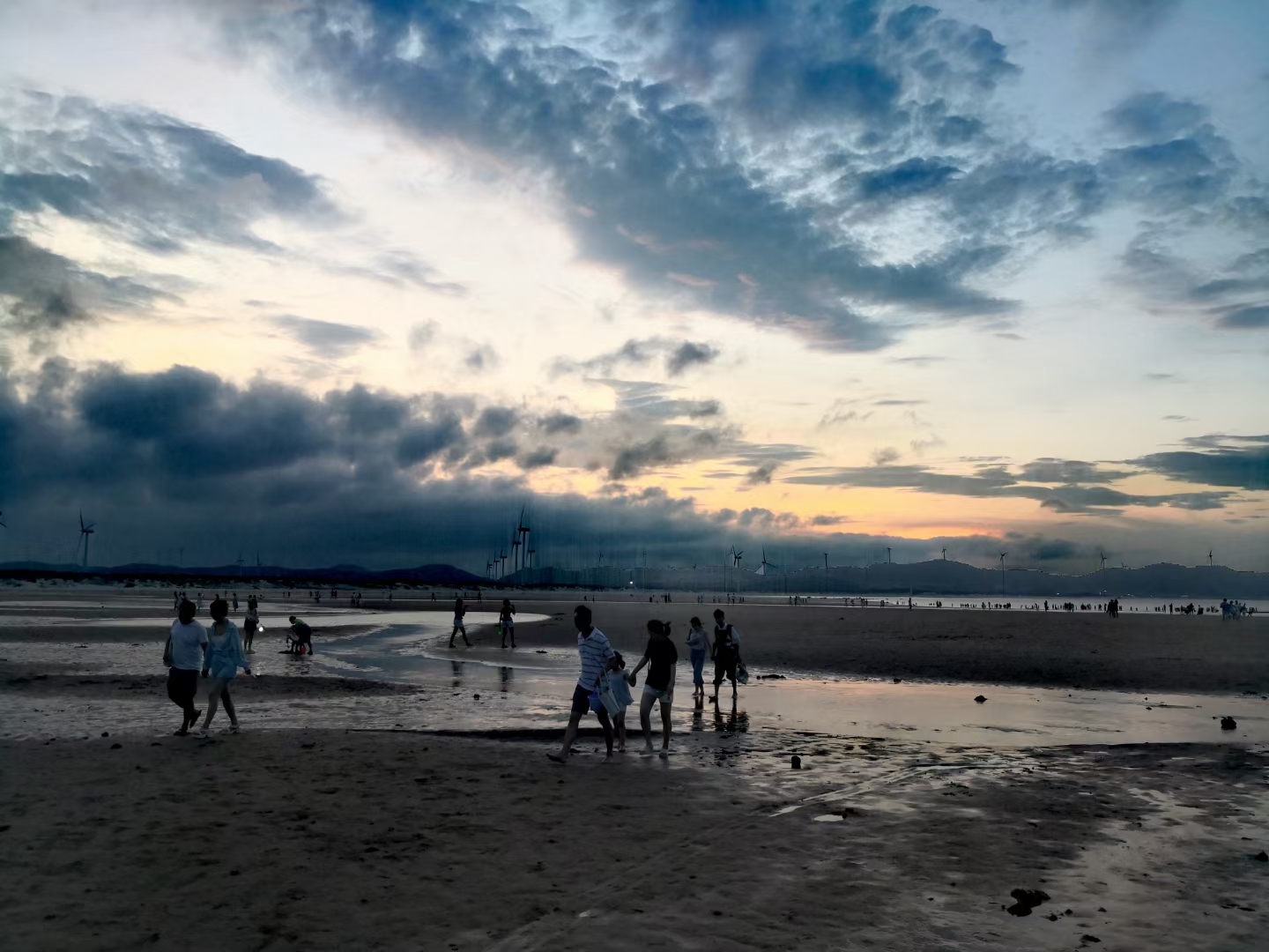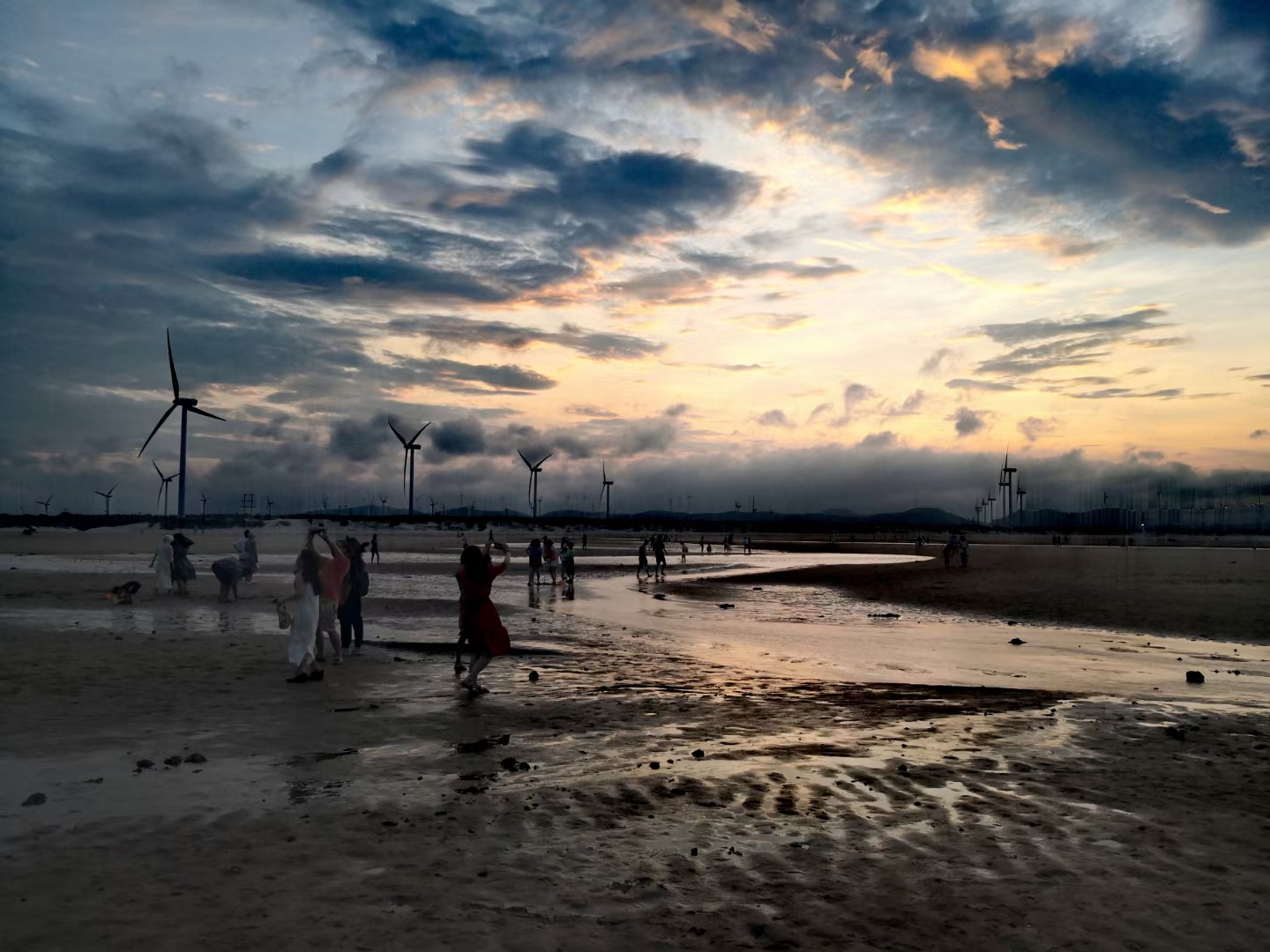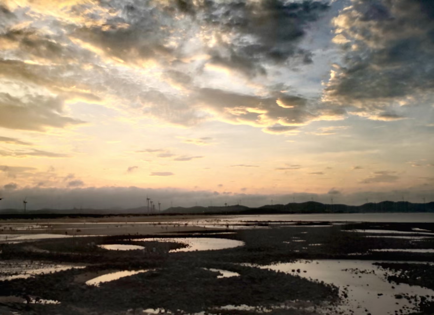 傍晚时分坐在民宿门前乘凉,突然发现对面山上的太阳光越来越亮了,心想欣赏“长江澳”的日落看来有戏。我们赶紧坐上车,一路上落日很美(图一),海里的大风车也很光鲜亮丽,我们心里暗自祈祷快些到、快些到。到了长江澳天空之镜依然绚丽(图二、图三、图四),以后风越来越大,天空间隐约出现了红云(图五、图九),谁料想风带来了一片厚厚的乌云,将晚霞严严实实地盖住了(图七、图八),让大家满心一场空欢喜。