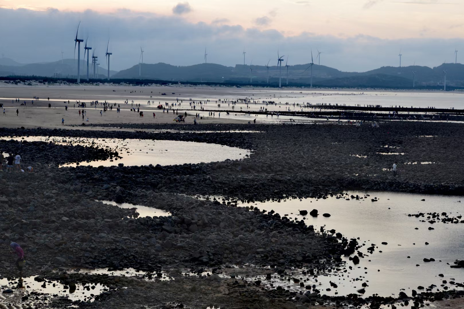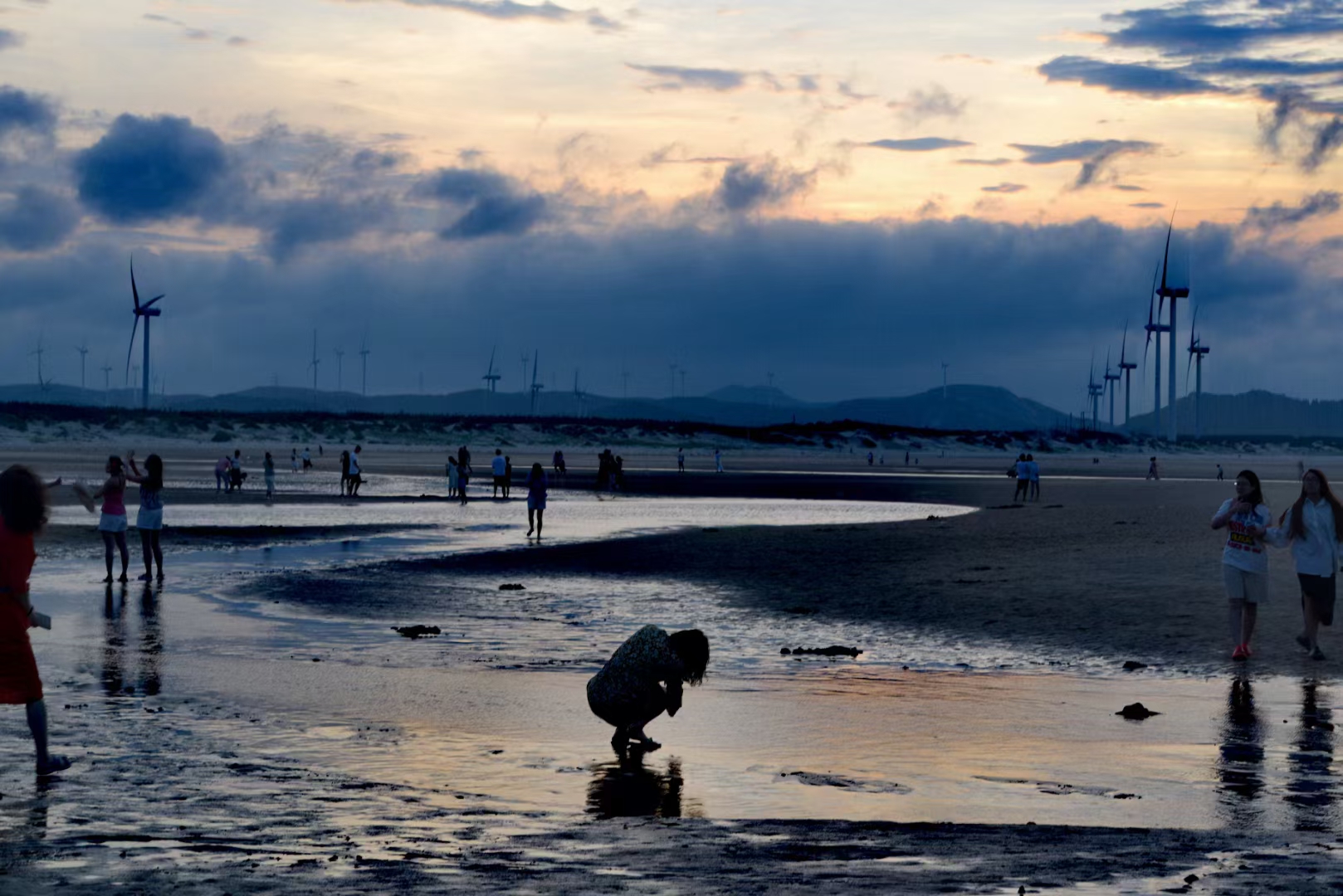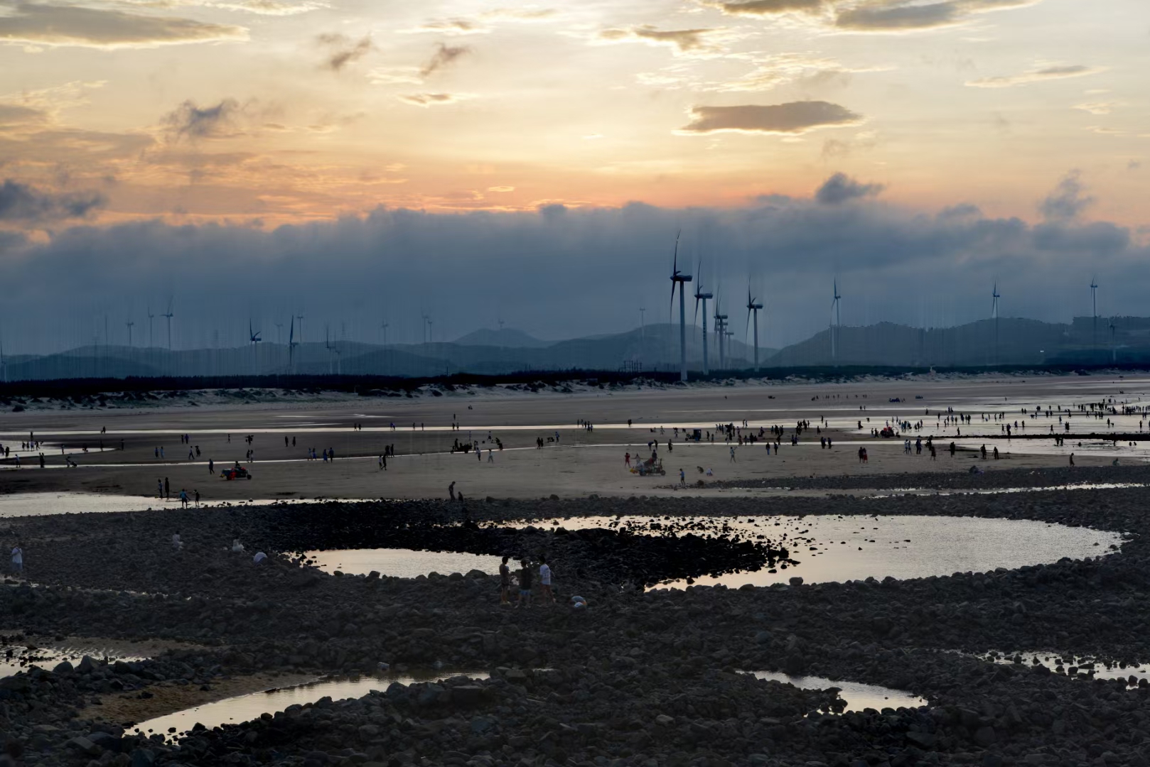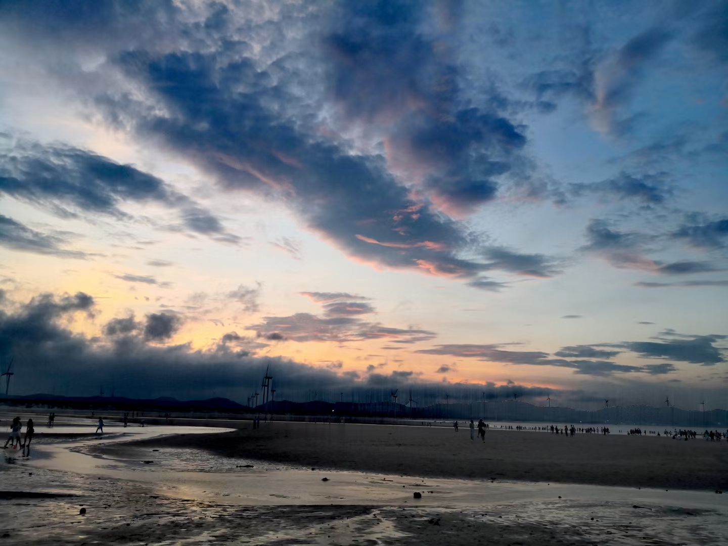 傍晚时分坐在民宿门前乘凉,突然发现对面山上的太阳光越来越亮了,心想欣赏“长江澳”的日落看来有戏。我们赶紧坐上车,一路上落日很美(图一),海里的大风车也很光鲜亮丽,我们心里暗自祈祷快些到、快些到。到了长江澳天空之镜依然绚丽(图二、图三、图四),以后风越来越大,天空间隐约出现了红云(图五、图九),谁料想风带来了一片厚厚的乌云,将晚霞严严实实地盖住了(图七、图八),让大家满心一场空欢喜。