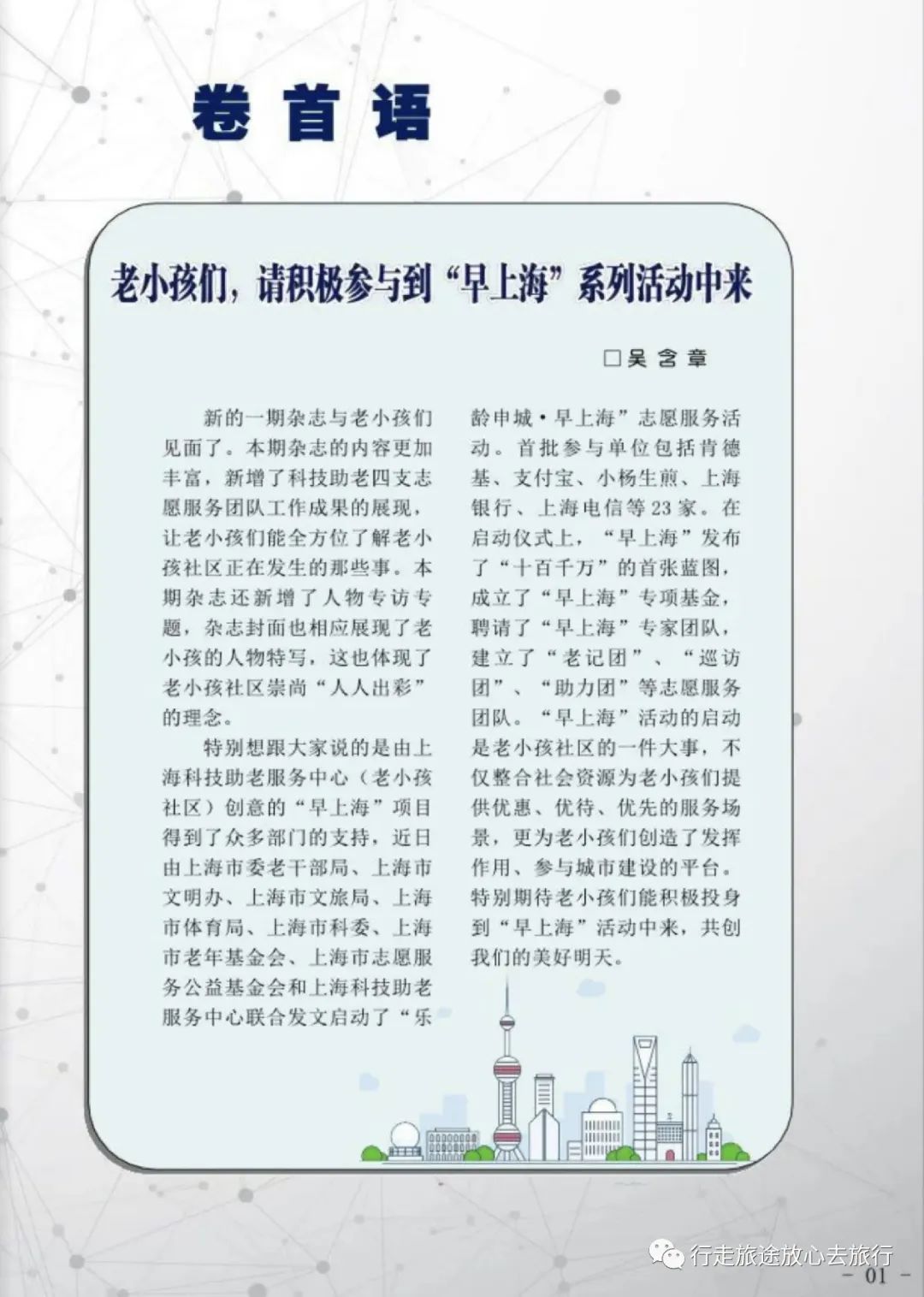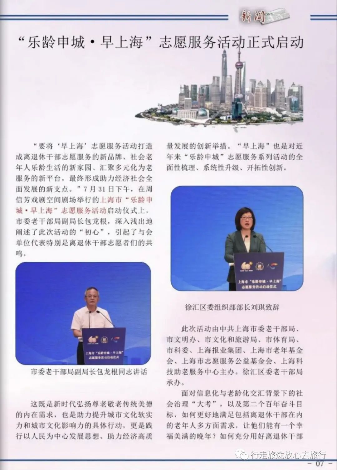 上海正在启动“乐龄申城·早上海”志愿服务活动,这项活动将打造离退休干部志愿服务的新品牌、社会老年人乐龄生活的新家园、汇聚多元化为老服务的新平台,最终形成助力经济社会全面发展的新支点;上海老人苑志强荣登2023年“中国好人榜”;上海老小孩们活动精彩纷呈……