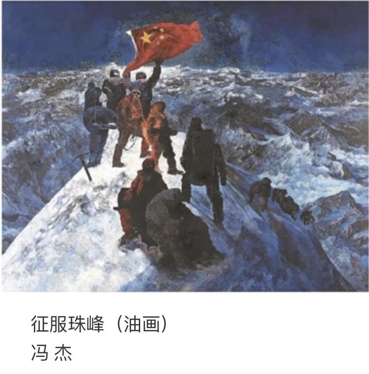 2009年,冯杰根据1960年中国登山队首次登顶珠峰的历史,创作了油画《征服珠峰》。这两件作品都展现出中国人不畏艰险、永不止步的攀登精神。