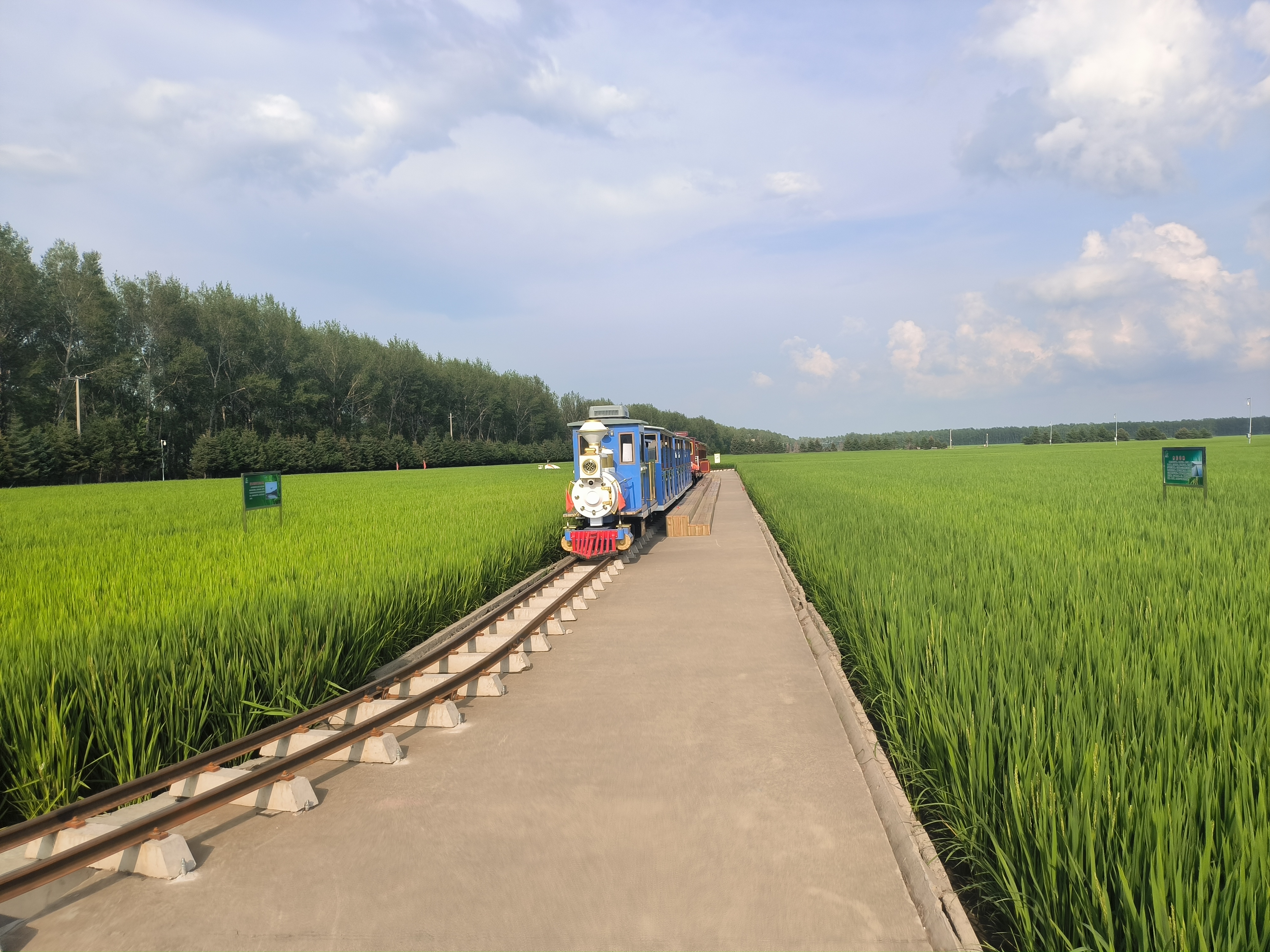 感觉九团稻田画单调,而十一团的胜出一筹,它的画面感丰富且多彩,观赏台的布局适中,环绕一周,美景尽收眼底。让我欣喜的是稻田画中的小火车,收费不高且能坐上近半小时。坐在上面,穿梭在绿色的田野里,仿佛如画如诗,令人心旷神怡,好想高歌一曲向长空。