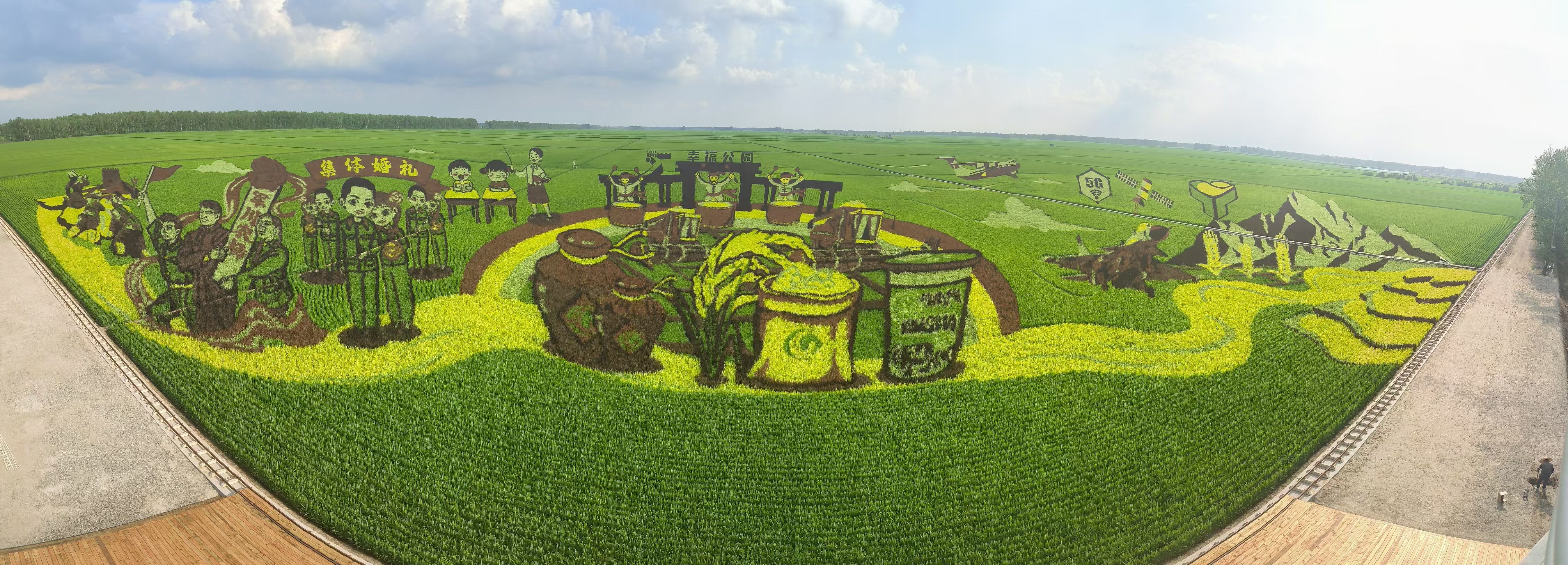 所到之处,展现我眼帘的画面颇为壮观,无边的稻田一角,用五彩的稻谷点缀出的一幅幅画作,反映了当代生活的憧憬,也追忆了当年一代垦荒人的艰辛付出,并用重彩浓笔描绘了知青年代所带来的现代文明。稻田画的写实,让来者驻足流连,抚今追昔,引来无限遐思。每一幅稻田画都是一个故事,反映了农垦的历史、文化和传统。