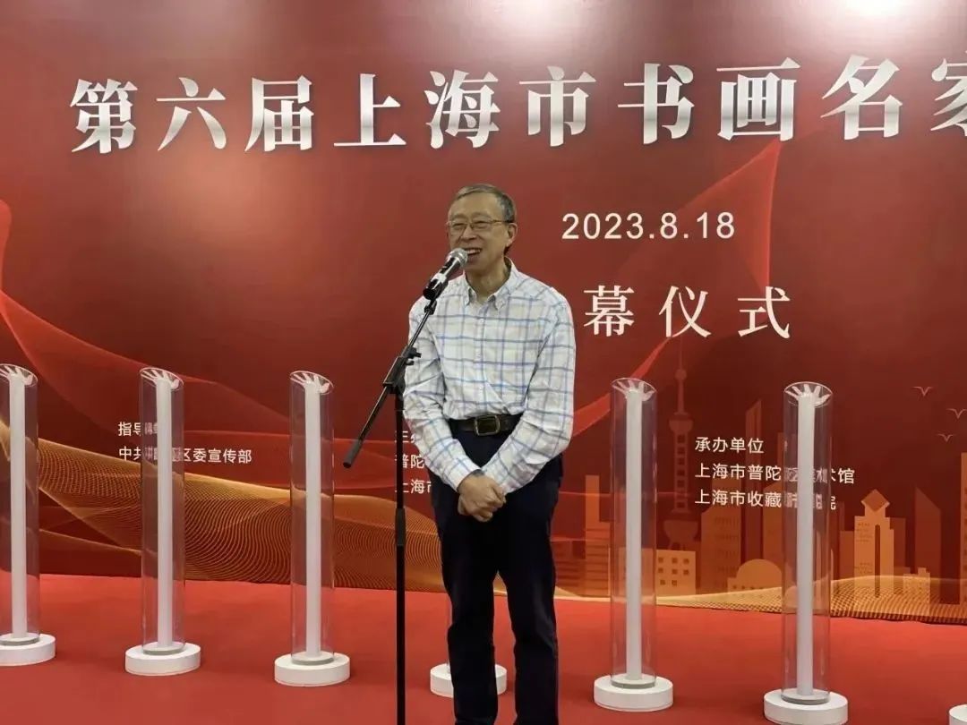 出席此次开幕式的领导和嘉宾有:上海市文化和旅游局副局长金雷;中共普陀区委常委、宣传部部长刘东昌;中共普陀区委宣传部副部长,区文旅局党组书记、局长周涵嫣;上海中国书法院副院长、原上海警备司令部政治部主任、少将田金生;原上海文旅局党委书记、原上海博物馆馆长陈燮君;中国书法家协会理事、上海市书法家协会副主席、上海市收藏协会副会长、上海市收藏书画院院长宣家鑫;上海市书法家协会副主席、草书专业委员会主任晁玉奎;中国书法家协会理事、上海市书法家协会副主席、妇女委员会主任田文惠、上海市书法家协会理事、上海市收藏书画院副院长、原闵行区政协主席吴申耀;上海市收藏书画院副院长、上海市政协原副秘书长兼办公厅主任张培基;原上海市文化广播影视管理局党委副书记、纪委书记沈卫星;普陀区文联主席、普陀区人大常委会原副主任张雄伟;普陀区文旅发展管理中心主任张谦;上海美术馆协会会长,上海视觉艺术学校美术学院院长朱刚;《书法》杂志《书法研究》主编、原书画出版社社长,中国书法家协会理事,上海市书法家协会常务理事王立翔;刘海粟美术馆艺委会名誉主任、刘海粟之女刘蟾等领导以及参展艺术家和书画爱好者共二百余人参加了今天的开幕仪式。