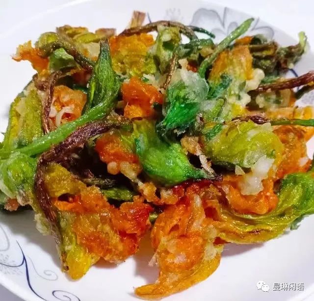 南瓜花要下锅前现摘,剪去花托多余部分,糯米粉、面粉各半,调成面糊,花朵在面糊中一拖一挂下油锅,至金黄入盘,花朵形色犹在,稣脆、清香、微甜,轻咀,微微瓜香索绕于唇间。