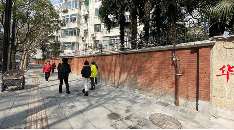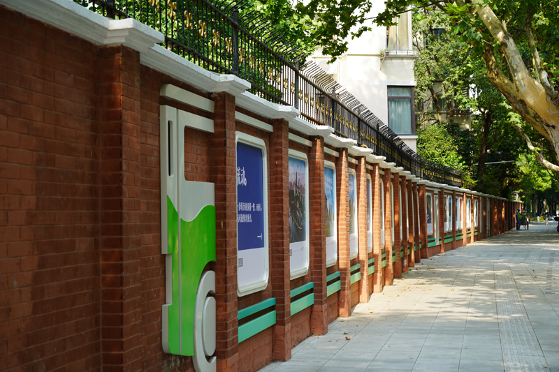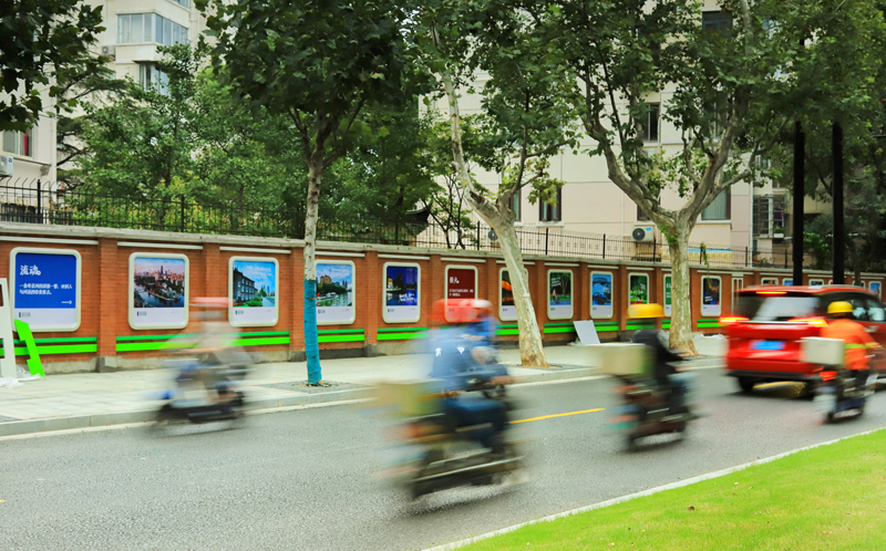 华院小区沿万航渡路一侧长约110米的围墙上,正在进行着“苏河时光影廊”展览,“流动”“成长”“烟火”“蝶变”四个篇章,展示了当地居民的摄影作品,将过去、现在和未来串联起来,为居民打造充满记忆和温馨的城区氛围。