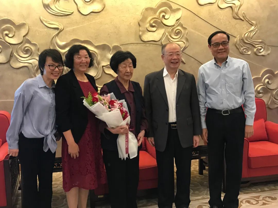 上海市教育发展基金会理事长王荣华(右二)带队到机场送于漪赴京领奖