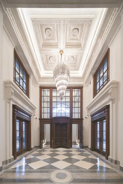 走进百空间卜内门洋行,推开古铜色铸铁大门,映入眼帘的是实木旋转门、白色石膏天花线脚、华丽的水晶吊灯,室内古典雅致风格让时间宛若回到百年前,浓厚的历史沉淀氛围扑面而来。