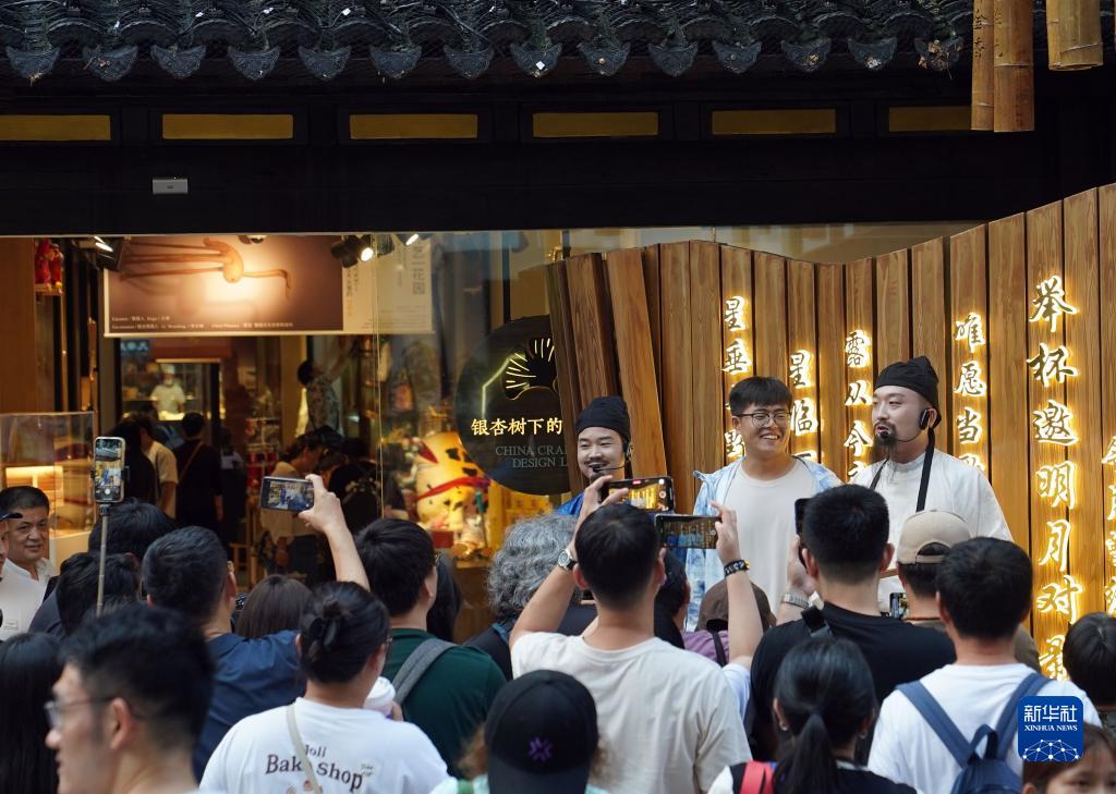 9月17日,在豫园商城,扮演李白、杜甫的演员邀请游客进行对诗和猜谜等互动游戏。