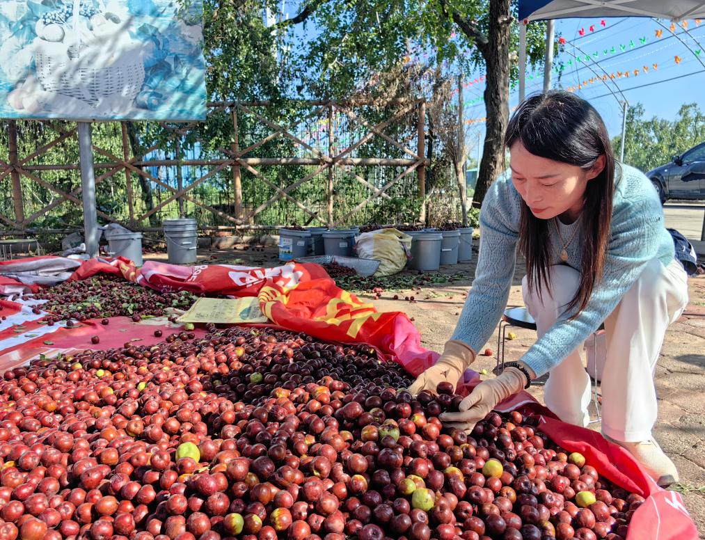 在村口的电商直播中心,村民郭丽和往常一样对着镜头推介家乡好物,“今年的长势特别好,肉厚核小,欢迎大家来我们村体验打枣的乐趣。我们还有枣干、枣夹核桃、枣酒、枣花蜜等15种产品……”