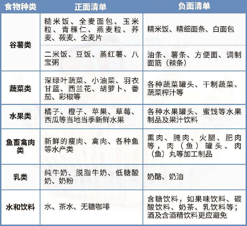 控制饮食量:外出旅游或聚会,谈笑风生间饮食量容易超标。要注意控制饮食量,最简单办法是进餐前看看两份清单,正面清单内食物可以多吃点,负面清单食物尽量少吃。
