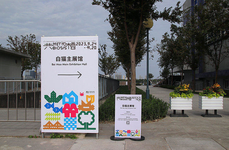白猫主展馆紧靠着龙腾大道上飞碟形的进沐巷渡口,草坪上形状抽象的雕塑及写真的小白兔形象,一下子就把人引入到艺术季的主题上去:作为城市的主宰,人如何与自然和谐共生。
