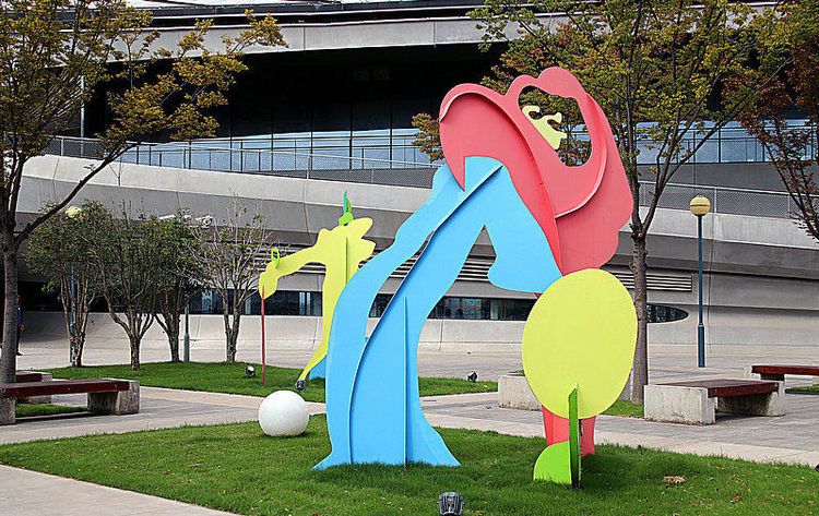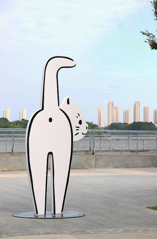 正如报道中说的那样,从北边过来,你只要看到沿路的猫的雕塑,朝着它尾巴所指的方向,你就能找到主展馆——猫知道方向。而这只白猫的尾巴所指处,即为主展馆了。