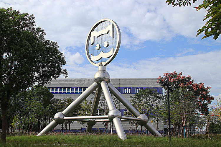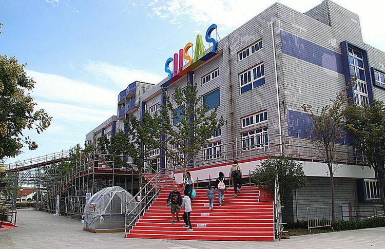 主展馆是由原白猫洗涤剂厂库房改造而成,保留了厂房的主体结构和大部分外立面原貌,新设的红色楼梯和坡道很有气势,楼顶上彩色的“SUSAS”的空间艺术英文主题词被蓝天白云映衬着,十分和谐。