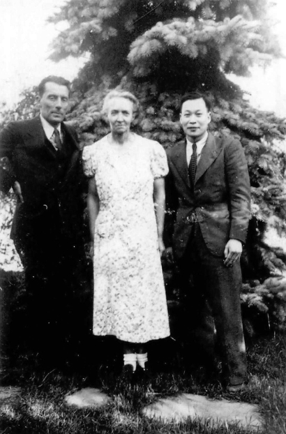 1948年,钱三强离开巴黎回国前在小居里夫妇住所小花园内与两位老师合影留念。资料图片