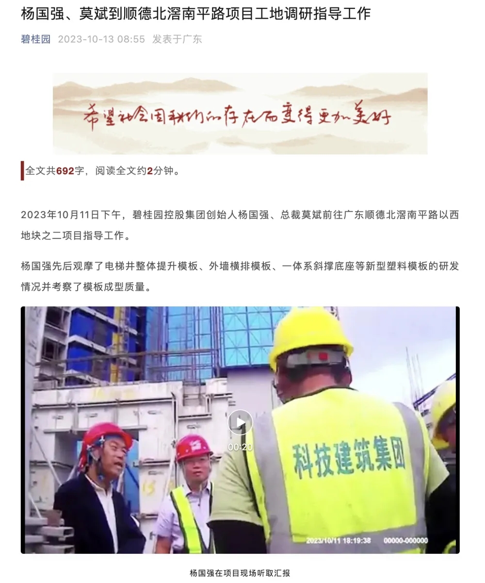 这篇官方通稿显示,“10月11日下午,碧桂园控股集团创始人杨国强、总裁莫斌前往广东顺德北滘南平路以西地块之二项目指导工作。杨国强先后观摩了电梯井整体提升模板、外墙横排模板、一体系斜撑底座等新型塑料模板的研发情况并考察了模板成型质量。”
