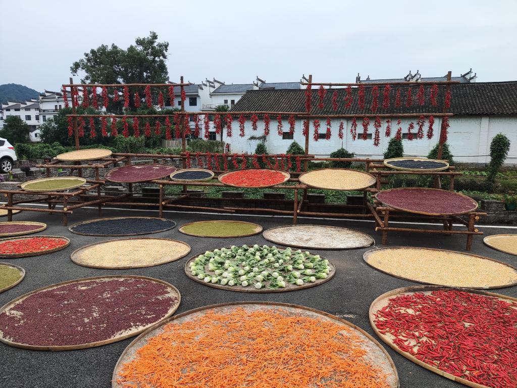 秋口镇王村石门自然村的农家小院里,房前屋后的晒架、竹扁上满是新采摘的红辣椒、胡萝卜、绿豆、红豆……一派红红火火的景象。