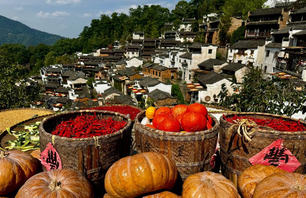 阳光下,五颜六色的农作物与白墙黛瓦的传统民居相映成景,构成一幅诗意的秋日丰收图。