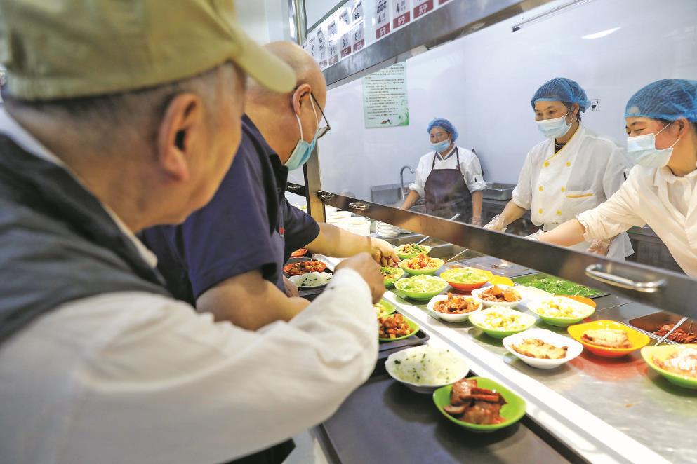 江宁路街道乐宁社区食堂顾客盈门,老年居民正在排队打菜。 本报记者 叶辰亮摄