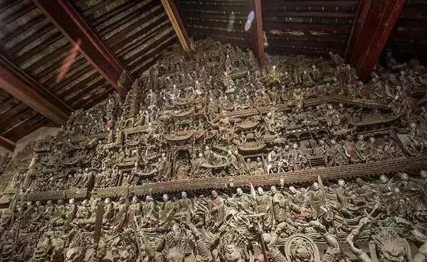 水陆庵壁塑群把绘画、圆雕、浮雕、楼刻艺术手段容为一体,在墙、梁、柱上镶满了三千七百多尊人物及自然界万物的塑像。