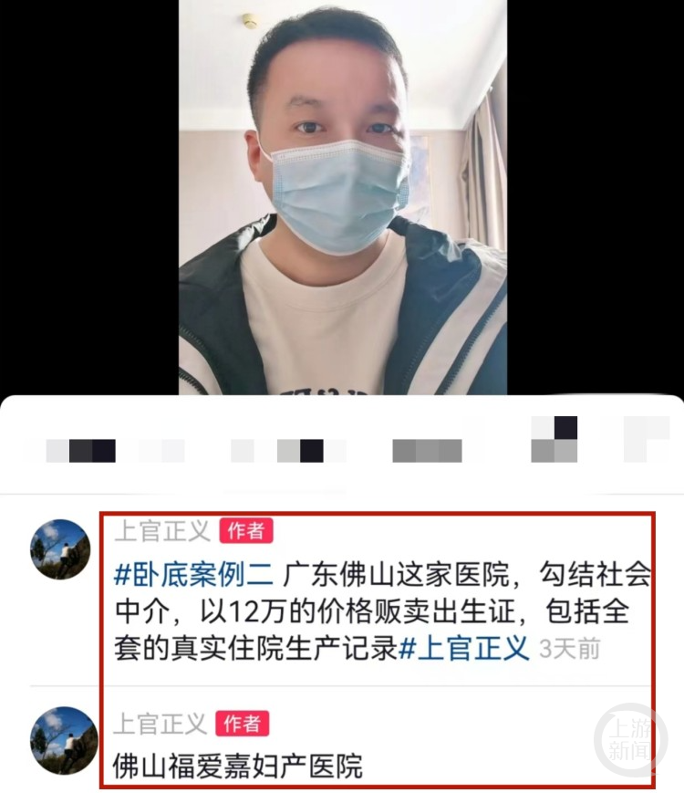 11月10日,打拐志愿者上官正义在其短视频账号下点名佛山福爱嘉妇产医院涉嫌贩卖出生证明。
