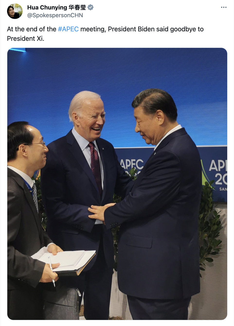 美国旧金山当地时间17日,亚太经合组织(APEC)第三十次领导人非正式会议结束时,美国总统拜登与国家主席习近平话别。