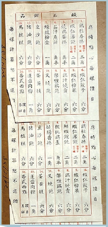 上世纪30年代的新雅饭店老茶单,各式茶点相当丰富
