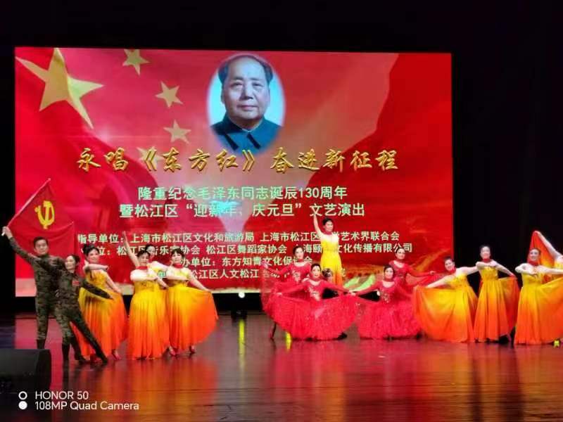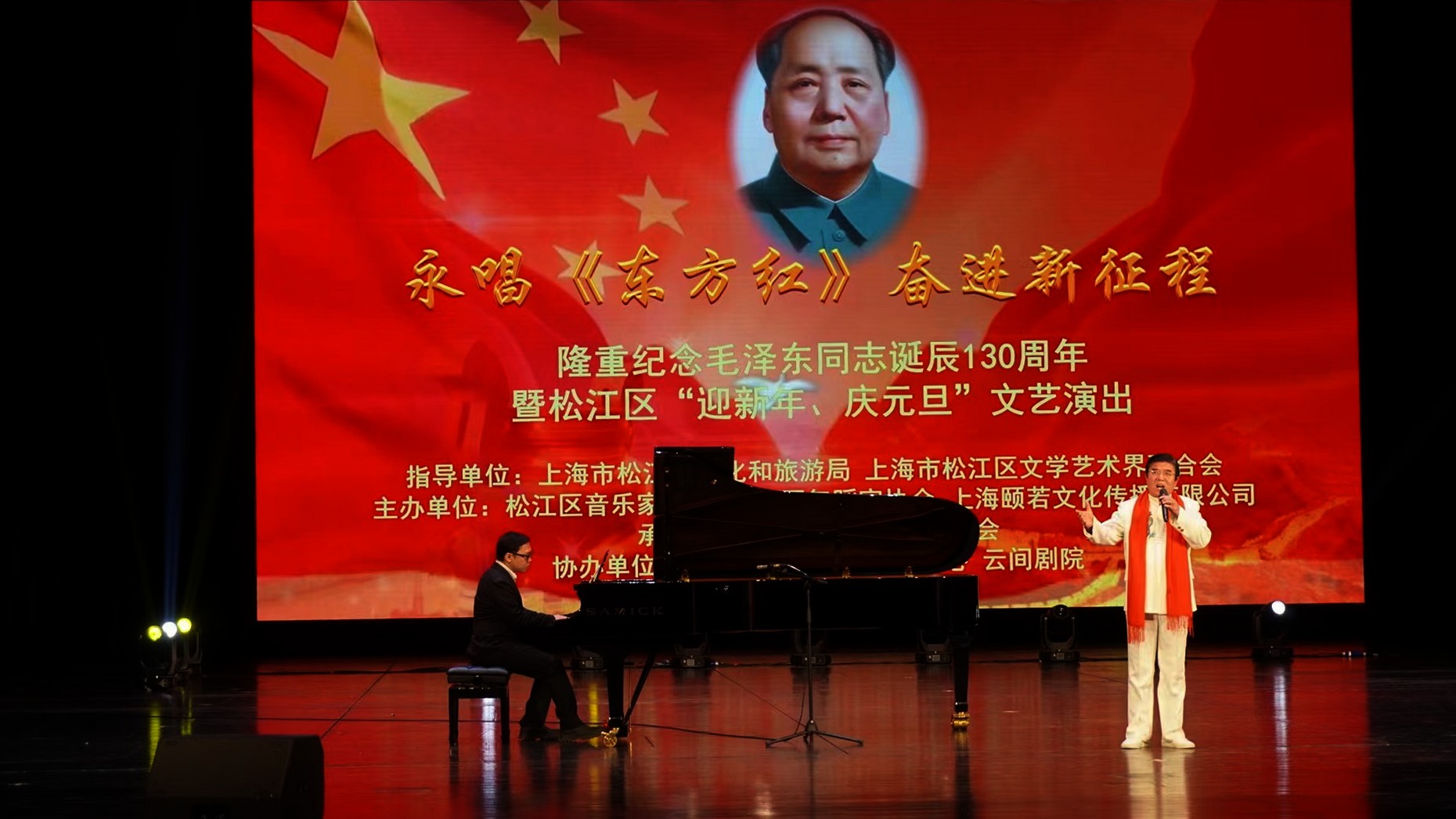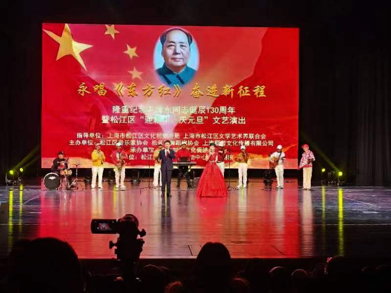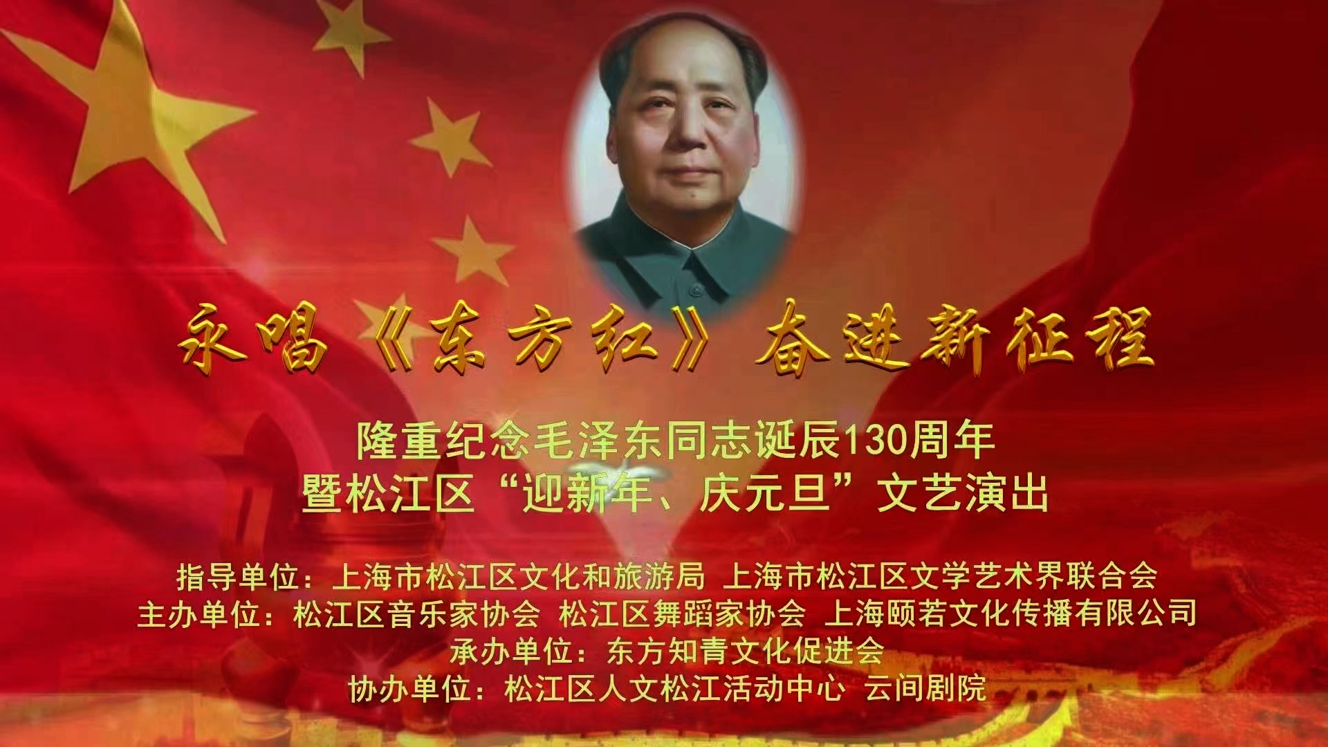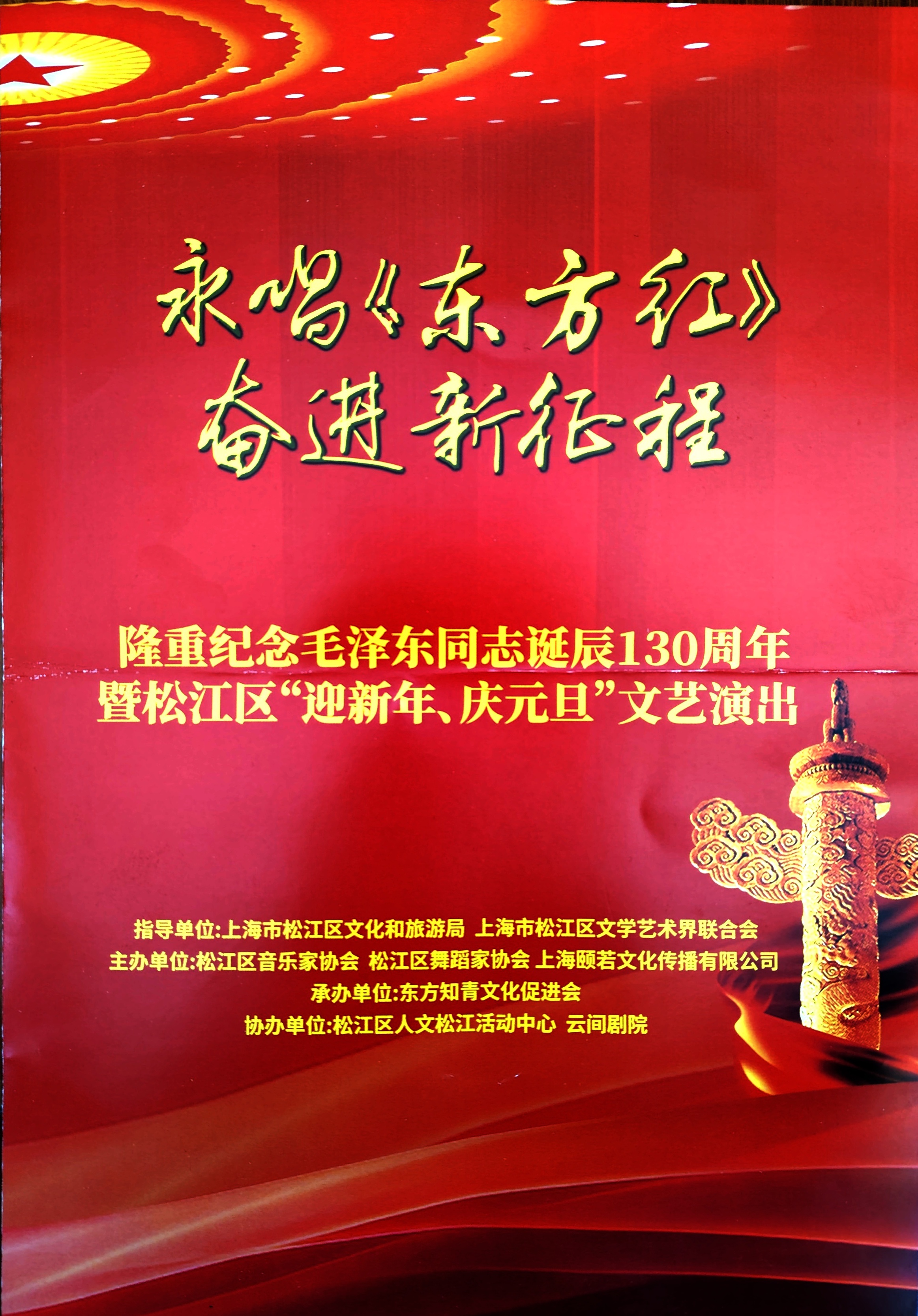 由上海市松江区文化和旅游局、上海市松江区文学艺术界联合会作为指导单位、松江区音乐家协会、松江区舞蹈协会、上海颐若文化传播有限公司为主办单位,由东方知青文化促进会和松江区人文活动中心为承办单位举办的《永唱〈东方红〉奋进新征程——纪念毛泽东同志诞辰130周年暨松江区“迎新年、庆元旦”文艺演出》,于2023年12月26日下午2时,在松江区云间会堂保利剧院隆重举行。