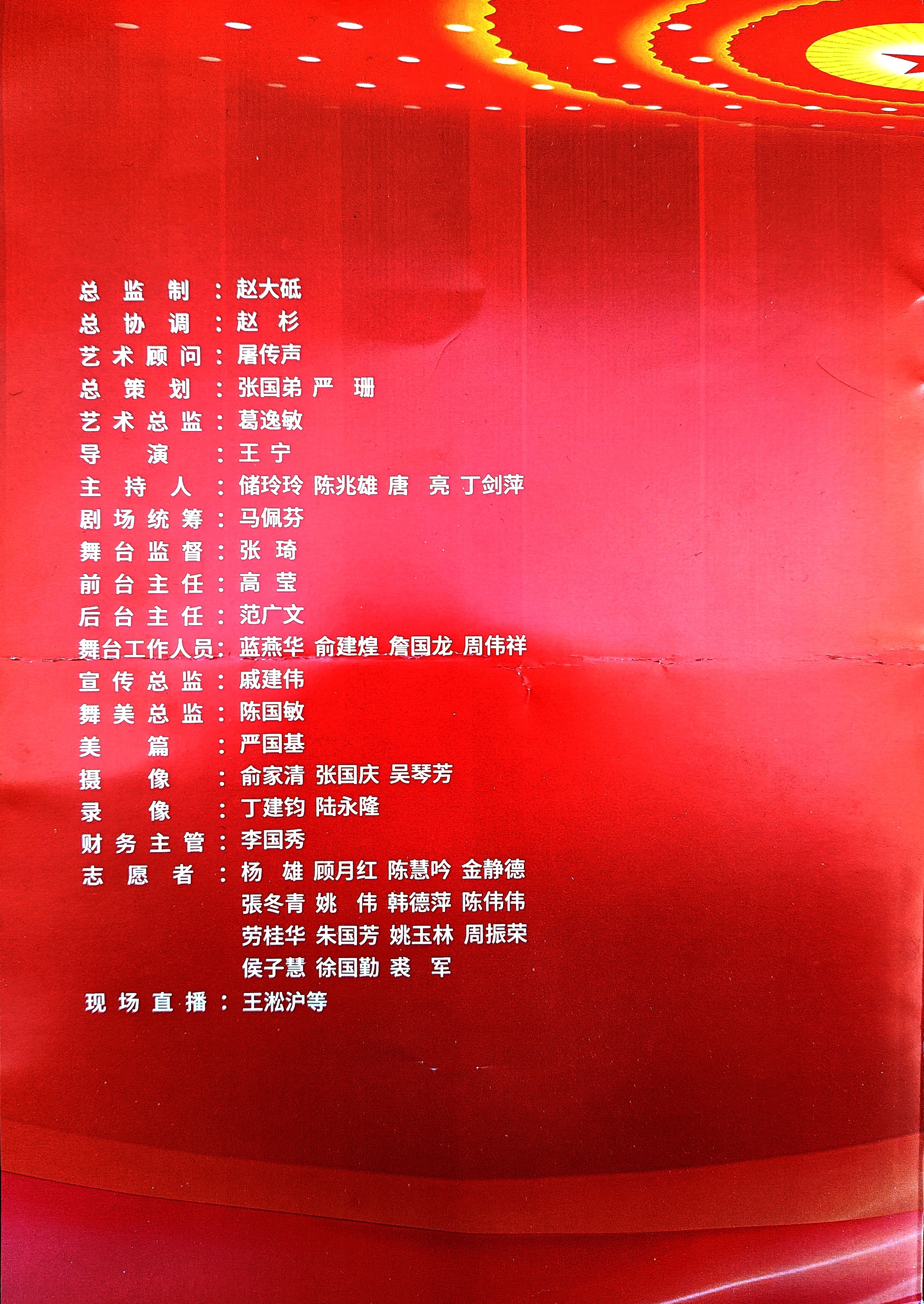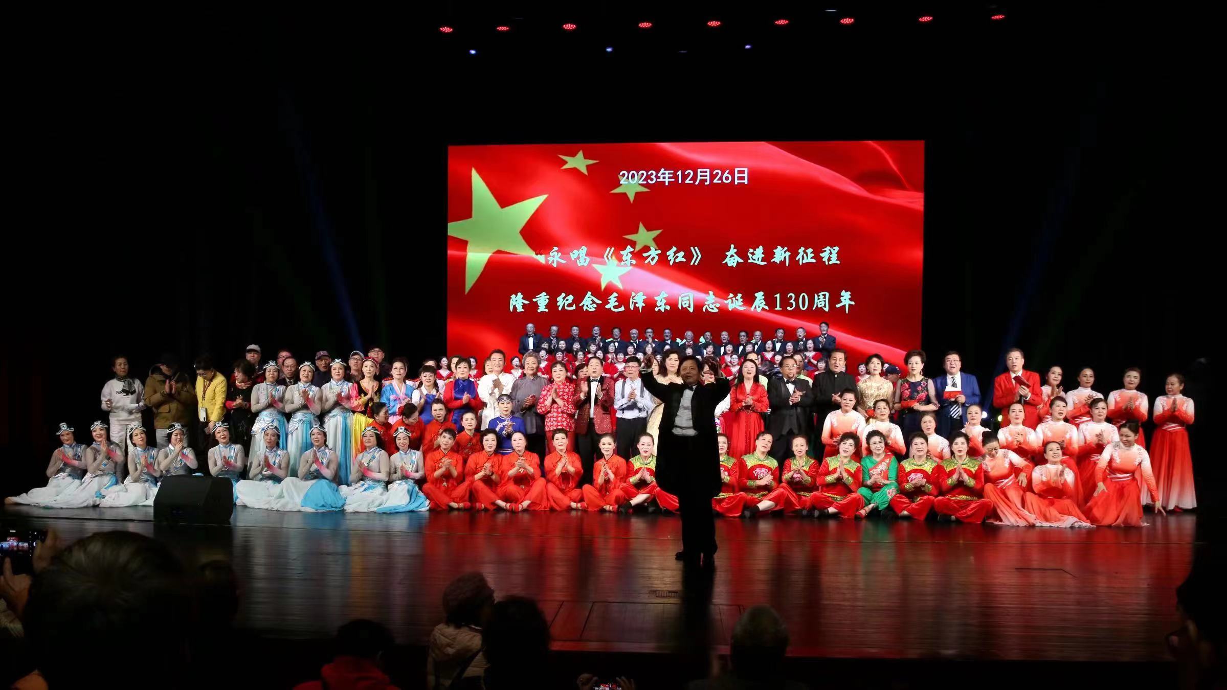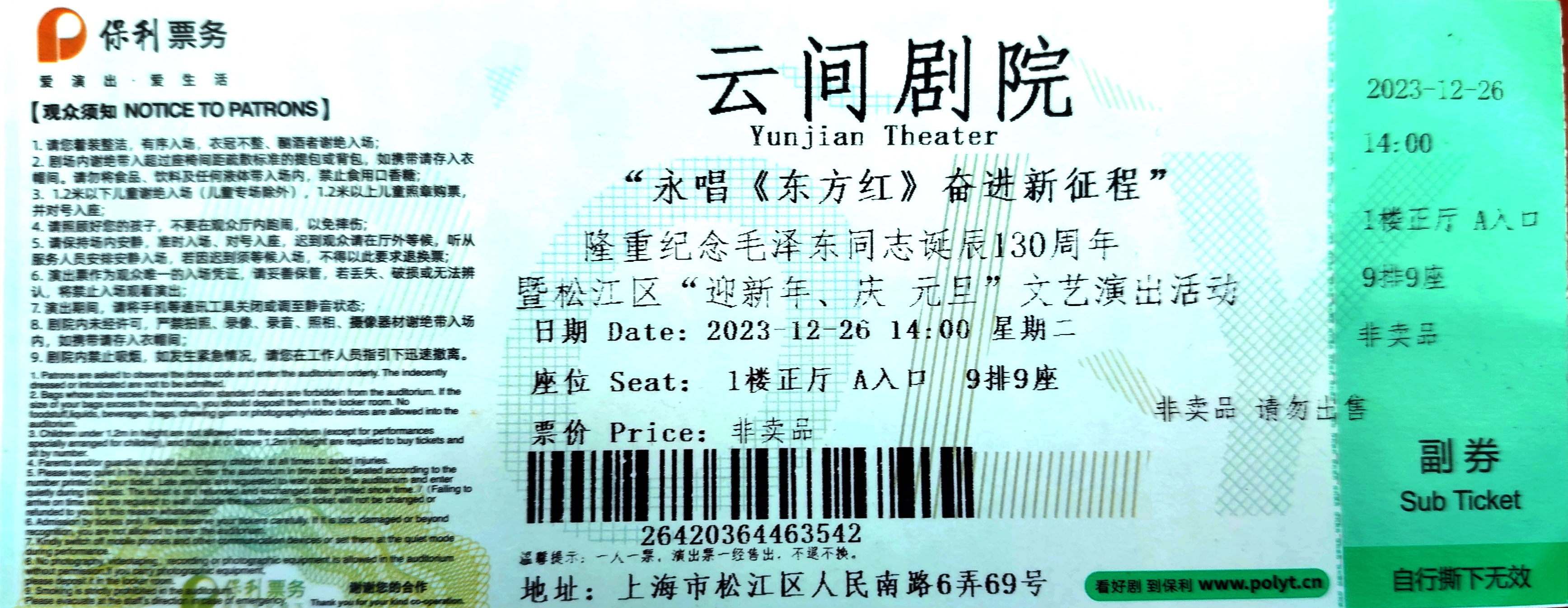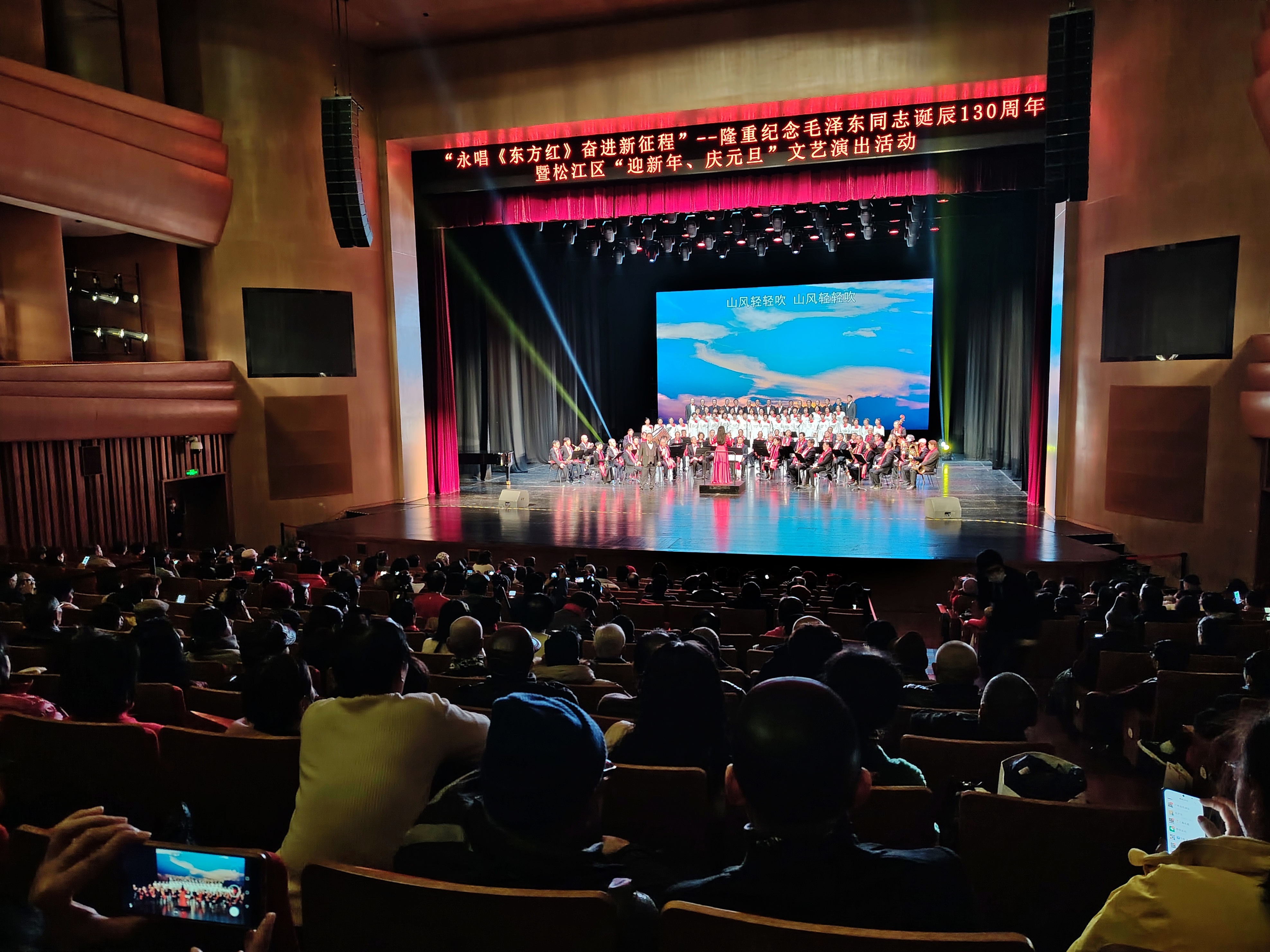 由上海市松江区文化和旅游局、上海市松江区文学艺术界联合会作为指导单位、松江区音乐家协会、松江区舞蹈协会、上海颐若文化传播有限公司为主办单位,由东方知青文化促进会和松江区人文活动中心为承办单位举办的《永唱〈东方红〉奋进新征程——纪念毛泽东同志诞辰130周年暨松江区“迎新年、庆元旦”文艺演出》,于2023年12月26日下午2时,在松江区云间会堂保利剧院隆重举行。
