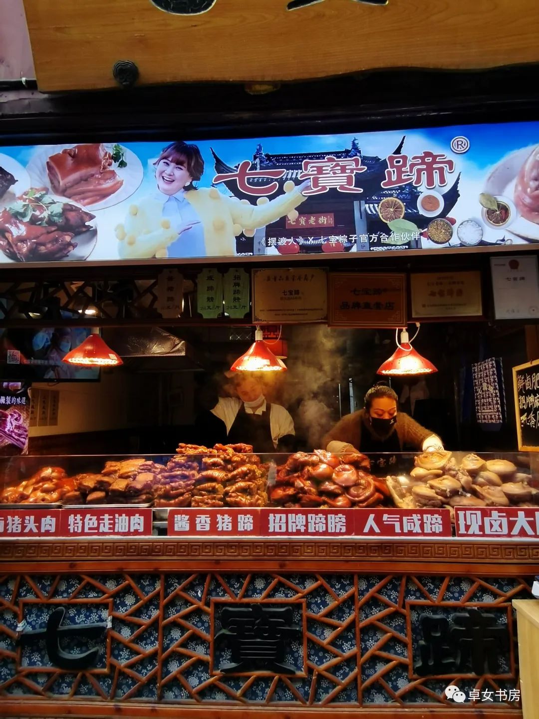 老街的本地店铺最热闹,总能看到一些老者说着吴侬软语,簇拥在店铺前,挑选心仪的美食。也许是儿时的记忆勾起了他们的食欲。我在七宝老街来来回回的徘徊着,徘徊在浓郁的人间烟火里,不知是那些五花八门的美食勾引了我,还是那一缕缕烟火熏香了心扉。当我穿过七宝长街又折身回到街口,经不住“七宝蹄”的香气引诱,也抛出几百银子,买了两件“七宝”,算是不枉此行吧。