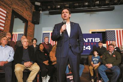 1月19日,美国共和党竞选人德桑蒂斯(中)在新罕布什尔州多佛参加竞选活动。新华社发