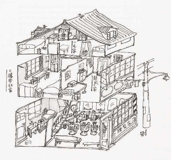 金宇澄手绘《繁花》插图:老弄堂的楼上楼下关系,因为此图而一目了然(此图原作正在外滩东一美术馆展出)